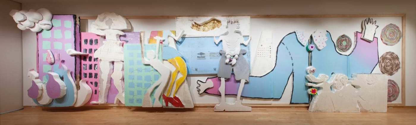 The first show I encountered, Made and Connected: Garry Noland and Peggy Noland, was a smartly laid out collaboration between artists who are father and daughter. Made and Connected is contained within a voluminous hallway, with the each artist’s work on opposite walls; so, as I did, a viewer might ping back and forth between them, looking for clues about how the works speak to each other. Garry Noland’s work looks like small, indifferent artifacts that might be found in a refuse pile at the local pottery studio, while Peggy Noland’s crudely carved polystyrene characters and cityscapes felt more aesthetically coherent — a story of a couple navigating urban terrain. Still, in both cases, the work was too casually blasé to appeal to me, though I appreciated the dynamic display design.