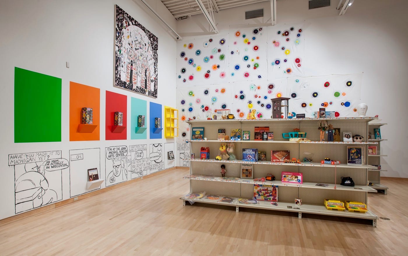 The largest of the exhibitions, Makeshift, curated by Michelle Grabner, includes Trenton Doyle Hancock, Jessica Jackson Hutchins, Brad Kahlhamer, Odili Donald Odita, Barbara Rossi, Greg Smith, and Alison Elizabeth Taylor. By far, Hancock and Taylor most clearly modeled how the process of moving through ideas works for these artists. In Hancock’s installation, several large paintings, some composed of small varicolored colors and one other containing bits of mixed media, sail overhead, while a custom-designed series of Black dolls that are packaged and arranged to resemble a toy store display is installed on small color-coded shelves along the wall below the paintings. (These dolls are part of Hancock’s Moundverse, a mythology the artist has been developing through combining toys with the ideas of imaginative play and the formation of self-image.) At the very bottom, a series of cartoon sketches like a narrative frieze depicts a conversation the artist has with his mother while he sits on a toilet. Hancock has also included several free-standing shelves and stocked them with toys and games. The comic strip conversation is funny not only due to Hancock’s multitasking, but also because it reveals how his mother doesn’t quite grasp the significance of his inclusion in this show or what the Kohler Art Center is, but nevertheless demonstrates care and affection for her son in requesting that he resume attending church regularly. Having seen Hancock’s work before and reviewed it for Hyperallergic, I recognize that he is a brilliant painter. But art exhibitions are most frequently geared towards creating showcases that elicit awe or marvel from viewers. However, in this show allowing visitors to see the relationships that condition an artist’s feelings and shape his backstory, it begins to create an intimate connection that moves beyond admiration and toward a more holistic appreciation of their concerns.
