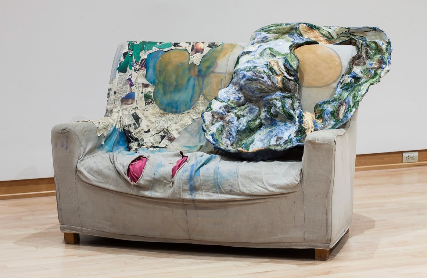 The separate exhibitions are displayed in such a way as to bleed over into each other, so when I visited the center several weeks ago, I often had to ask the docents present which exhibition I happened to be standing in. It should be noted that these guides were quite interventionist. They often approached me, and without waiting for me to signal interest, offered me particulars about the work and the artist, such as informing me that Jessica Jackson Hutchins’s ceramic pieces, which I witnessed lying inertly on sofas and other furniture in her section of the Makeshift exhibition, were utilized by performers at the show’s opening. I was told that dancers wore and held the sculpted pottery and served food visitors out of them. Initially, I was a bit discomfited by not being left alone to my own devices, but I have to admit that the information they imparted helped me understand the work in a fuller way than I would have on my own.