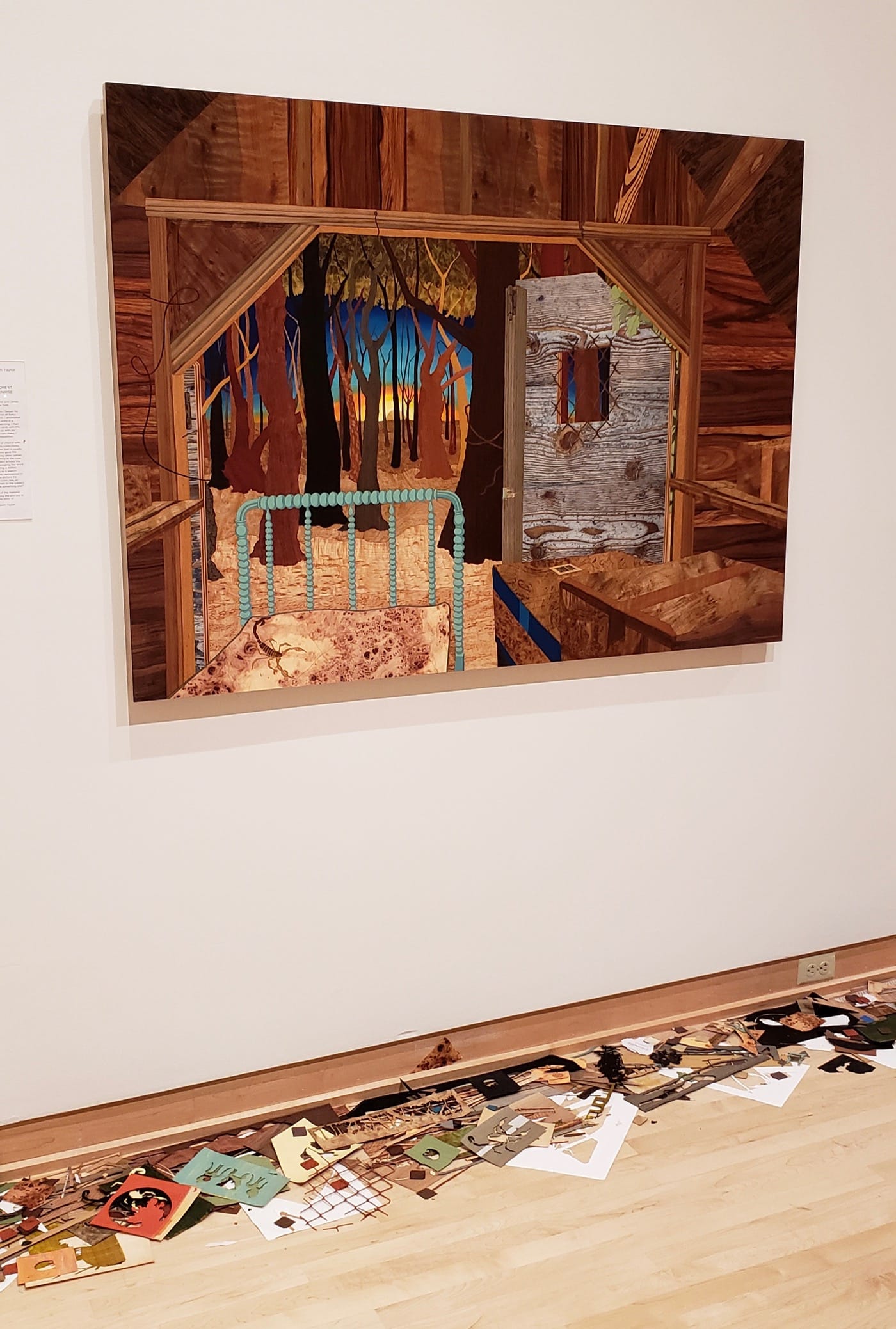 Alison Elizabeth Taylor’s small installation aids the viewer in coming to an understanding of her process in a detailed fashion. The wall text associated with her work tells the story of “Shed Bed Chainlink Forest Scorpion Sunrise” (2018) being developed out of a game of making gouache paintings to represent each of 48 random words, then reducing those to six random images from which she would make her composition. Taylor’s practice typically uses marquetry, layering pieces of diversely colored wood that are combined in such a way as to give an image dimension and texture not quite achievable in the same way by painting. What gives a window into her practice is the detritus she’s left on the floor around the finished product: all the bits and pieces that are left over from Taylor’s manipulation of materials.