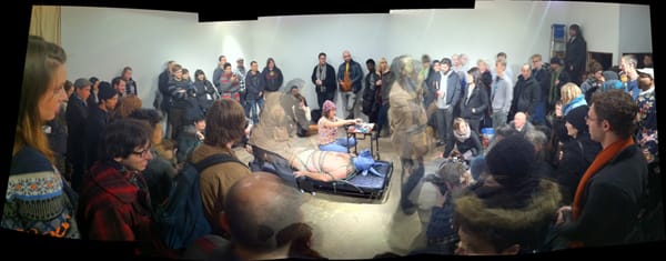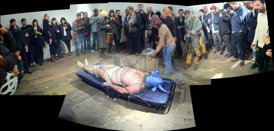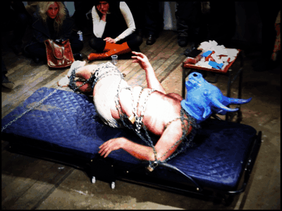 A almost entirely naked man is laying in the center of the room. Only a loin cloth covers him. He is wrapped up in green chains. He wears a blue bull head mask — he is a minotaur. A woman in a campy pink nurses outfit is extracting blood from him. It looks like a German christ laying dead scene from an art history seminar. The crowd is hushed and quiet.