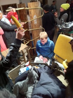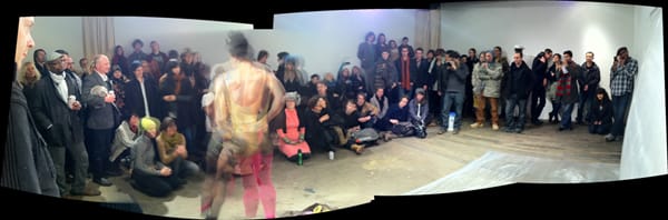 A girl starts to crawl through the scene. The AHHH thing stops. The banana refrain is back. A stinky sweater gets tossed near this blogger. The performer is now running around the crowd. Everyone and everything is in the center of the room. He is now just making inaudible noises. The crowd starts to cheer. The piece is done.