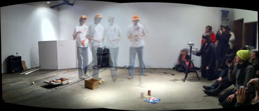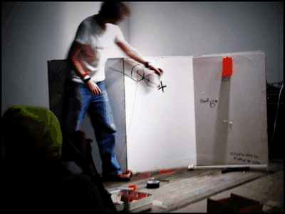 Adams seems to be creating a contraption of some sort. It feels like some kind of high school science experiment. His energy is calm but when he said earlier that we don’t know what he’s going to do, I did get a little concerned that we would see blood or some sort of cutting. He’s rigged up some string from an illustrations from “the universe” he drew earlier on the board to the Moxie sodas on the floor. The incessant pounding in the background makes it feel like some type of project where something is being constructed or created.