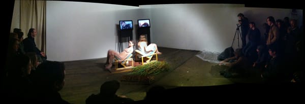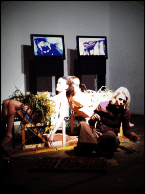 Suddenly, the nude women get up from the chairs. The TVs are turned off. All three leave the stage. The piece is over.