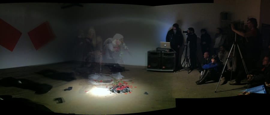 The room just got dark and there are body bag like things on the floor and other props. A woman in a black dress with a bouquet of red roses walks in. A sound track with birds chirping in the background plays. Her face is painted white. She closes her eyes, stands still, but her mouth moves. She seems to be in a trance (not sure)