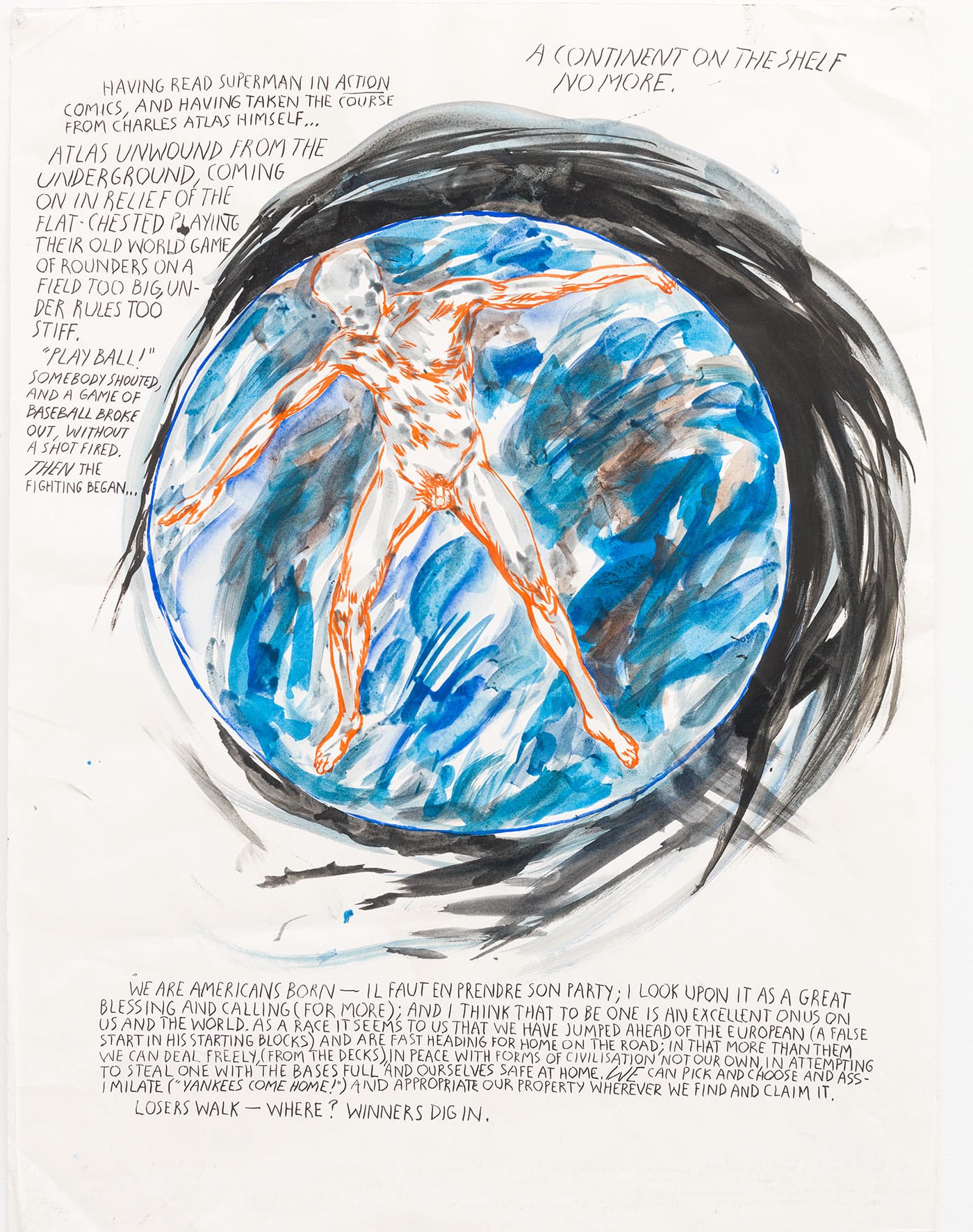 There’s more to it, though. The very literary work — with nods to authors from Henry James to Marcel Proust throughout — of the California-born Pettibon often echoes Joan Didion and Nathanael West, the grotesqueness of The Day of the Locust and plenty of “Dreamers of the Golden Dream.” It’s about these ideas we as a country once had, visions of “American exceptionalism” and how they rot from the inside out. His art contains flashes of the LSD burnouts in “Slouching Towards Bethlehem” and glimpses of the wasted American youth from books like Bret Easton Ellis’s Less Than Zero. A specific strain of California culture is noticeable in his paintings of surfers and revolutionaries, telling stories of a beautiful but damaged place. Just like it has for all of those authors, for Pettibon, California and all of its failed promises represent America.