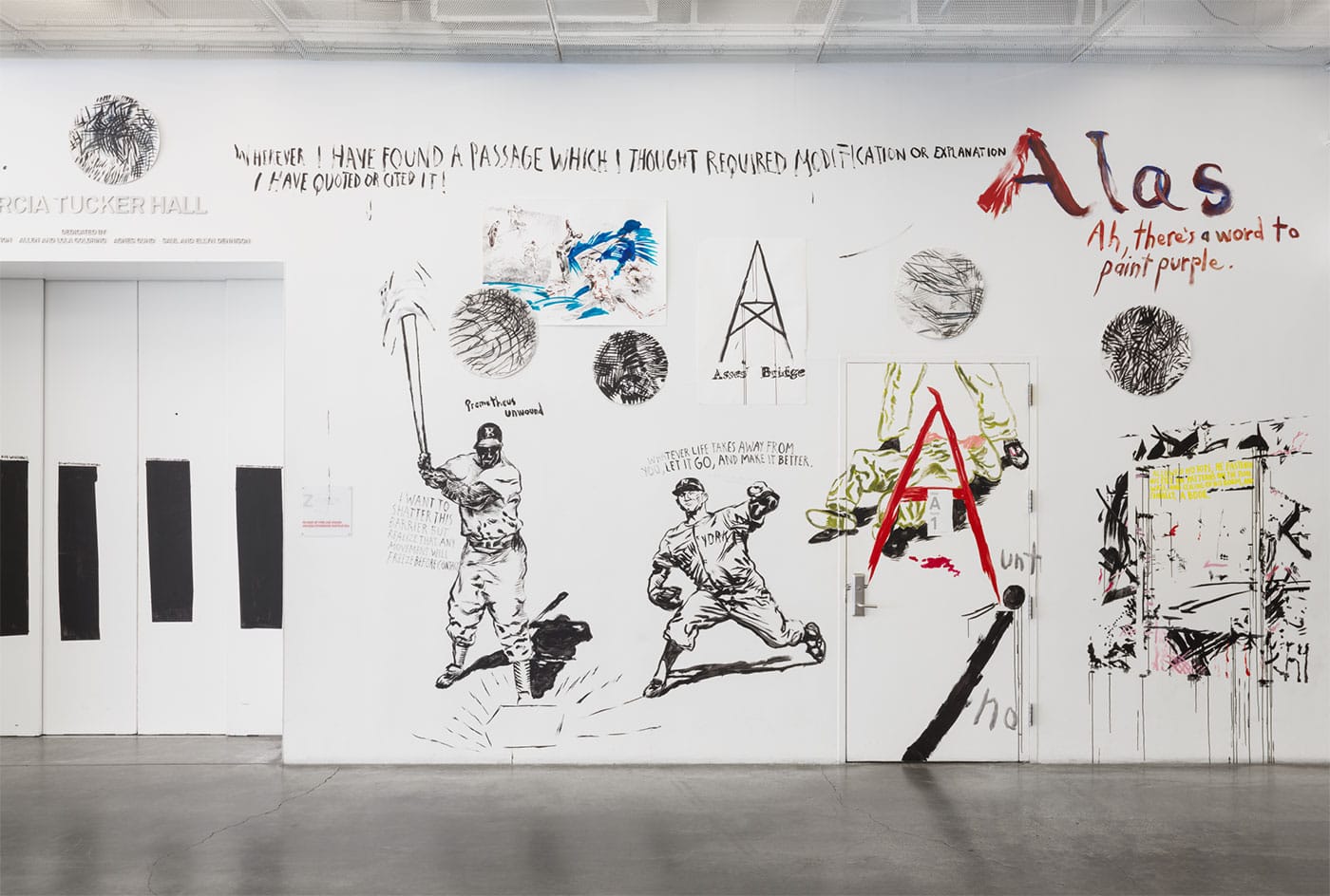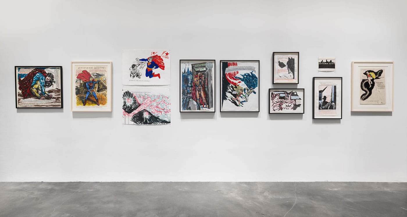 It might not look like there’s a message in the countless drawings tacked to the walls next to framed paintings and murals — here today on the New Museum’s walls, gone when the exhibit is finished — but there is. There’s a buildup as you climb the floors: drawings of Jesus early on, Black Flag and Sonic Youth record covers and flyers next, the baseball drawings that I find the most interesting, and then, finally, the fourth floor with the crowds of tourists, people who read about the show in the Times, students and punks in Cro-Mags shirts and denim jackets covered in patches, or the bearded and bespectacled hardcore kids all grown up and ushering their children around, many of them crowded around the image of one of our most iconic superheroes, his face looking a lot like Reagan’s as he gets decked, with the caption reading, “Do you see stars, Fascist Superman?” Some of them take pictures of the art because it seems to have extra-special significance right now — it’s part of that canon, one that I’m guessing Pettibon doesn’t want to be included in.