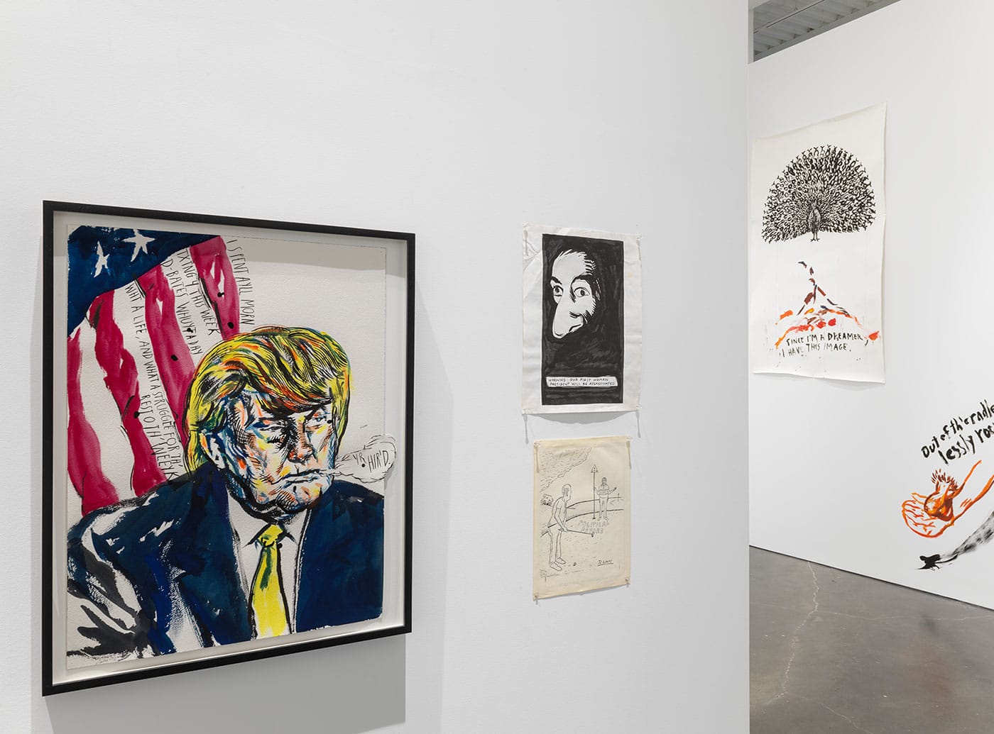 What’s distinct about Pettibon is that he hasn’t spent his time drawing his ideas of what might be; his art has always explored how fucked up and strange the world already is. It’s essentially one long process of an artist trying to figure out this GIF of a dumpster fire we call America. If you’re just passing through the New Museum, unfamiliar with Pettibon maybe save a few album covers he drew, the message that shouldn’t be lost on you is this: things run deeper than we want to admit. Today’s disaster didn’t start with Trump or Obama, either of the Bushes or Reagan. Pettibon’s got drawings of president #45, sure, but on the fourth and possibly most striking floor of the exhibit, those drawings are in close proximity to images of other American presidents, plus Osama bin Laden, Lenin, Hitler, and other bad guys and horrible events from the 20th and 21st centuries. The whole show spans six presidents, 9/11, multiple wars, and a crossover into the weird and frightening, brave new world we’re living in. Looking over so much of his work in one place, it becomes clear how attuned Pettibon is to the fact that all leaders do bad things, and how that’s a big part of what got us into this current dystopia. We seem to finally be catching up to what Pettibon has been saying through his work — and, if you can transcribe it, his Twitter account — all along.