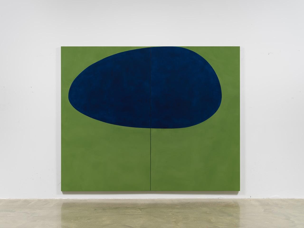 A few hours later I was sitting in Frecon’s studio, with its double-stacked windows facing north, looking at three large, two-panel paintings without the aid of electric light. It might simply have been because of the orientation of my chair or my distance from the painting — though I know it was much more than that — but I found myself staring at a green painting with a large blue form, elliptical but not symmetrical, floating near the top.
