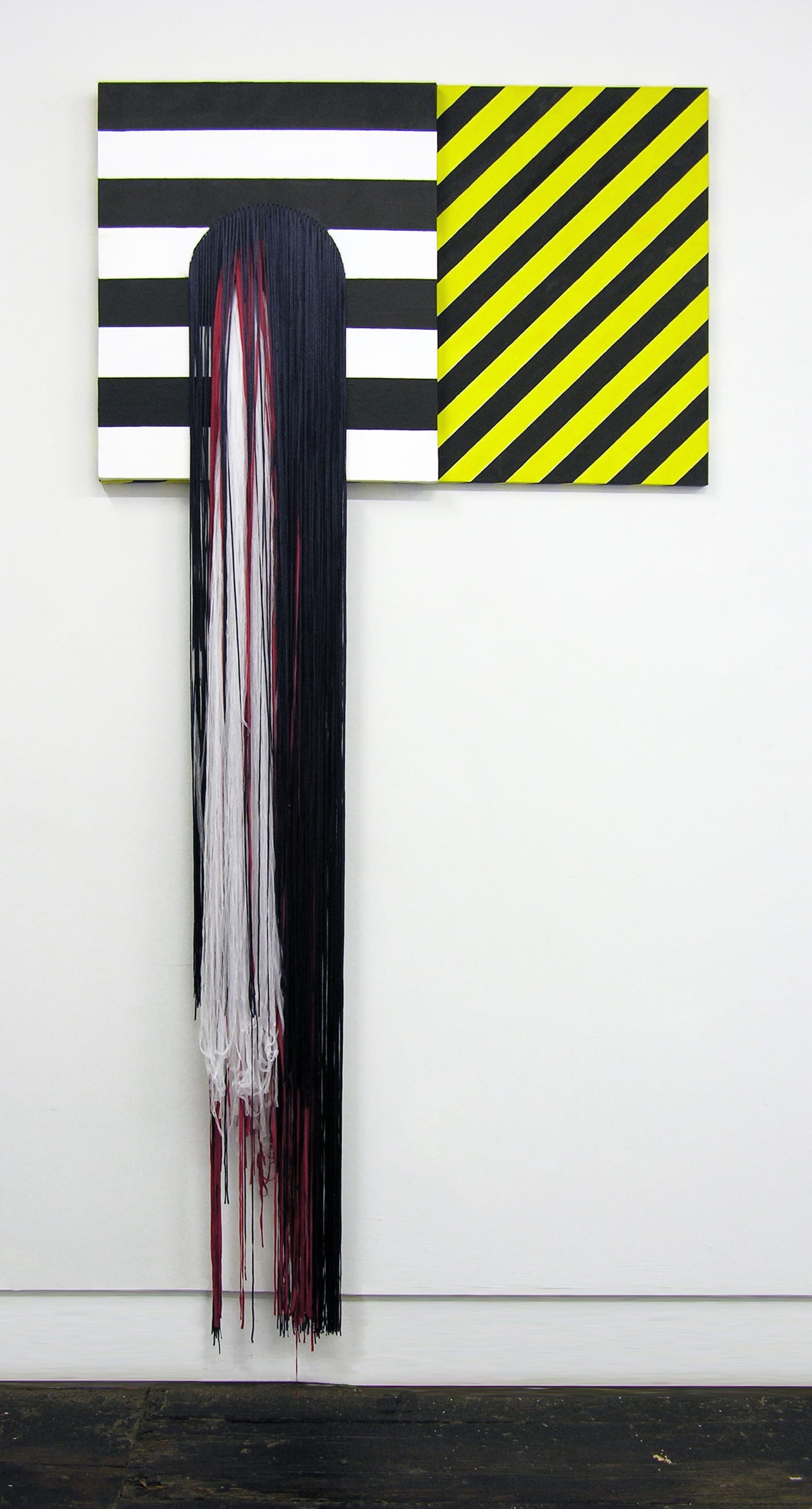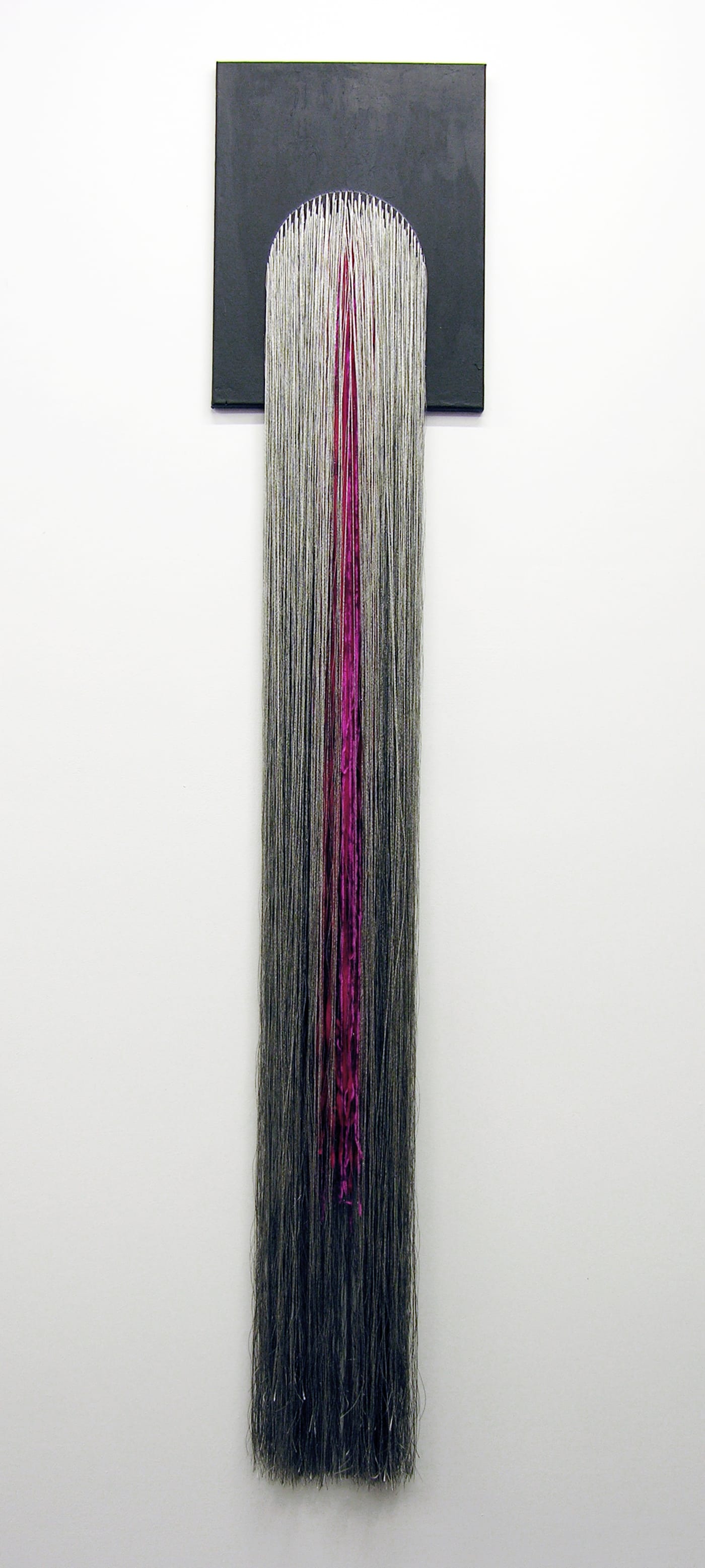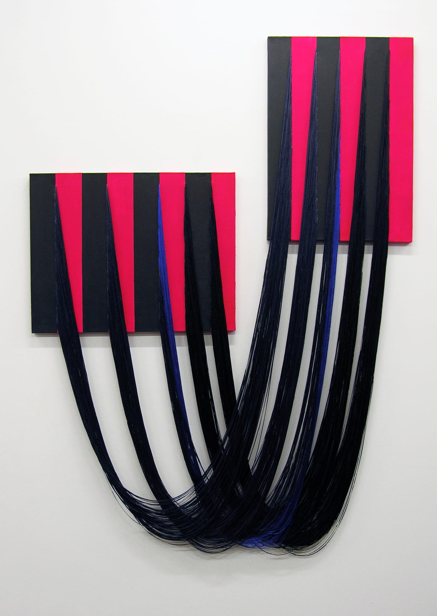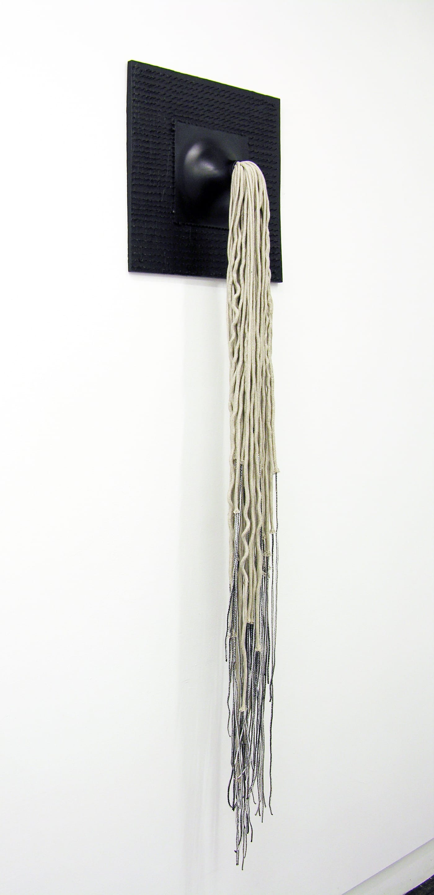 Her sculptural work makes use of hard “support” elements, which allow fiber to flow from the wall, like water, as in “Armor Faucet,” a large-scale sculpture that faintly evokes the look of a wrung out mop, or “Spirit Spout,” in which a hidden swath of fuchsia fiber is surrounded by grayish-white strands, as though it were the slowly transforming hair color of a person who’s “going pink” instead of gray. Several other works depend on a more traditionally “pop” color palette, such as “Equilibrium,” which is framed by a “caution”-style yellow and black field of stripes, or “Partners,” which sweetly joins two panels that have the same dimensions, arranged perpendicularly, and stitched together with black yarn.