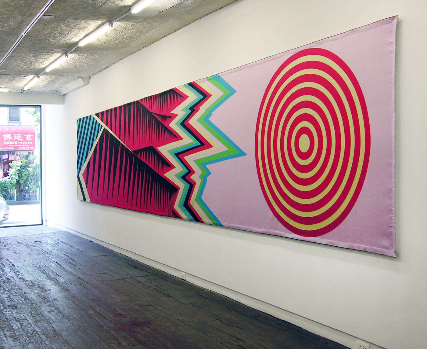 Trace the dynamic zigzags, sunbursts, and bullseyes in Liz Collins’s “Zagreb Mountain Scroll” with your eyes, and you can almost hear the exclamations of a sharp impact, cartoon-style: “THWAP!”, “POW!” But this piece isn’t cartoonish or crudely printed, like a vintage comic strip, nor is it precisely painted, like a large-scale Pop Art scene. Look closely, and you’ll see that the surface of each stripe and razor-sharp boundary line is made from a soft, shimmery blend of Jacquard-woven silk and polyester. Were you to touch this nearly 26-foot-wide work (which you shouldn’t do — but it’s very tempting), its surface wouldn’t feel cool and clinical, but comfortable and fuzzy.