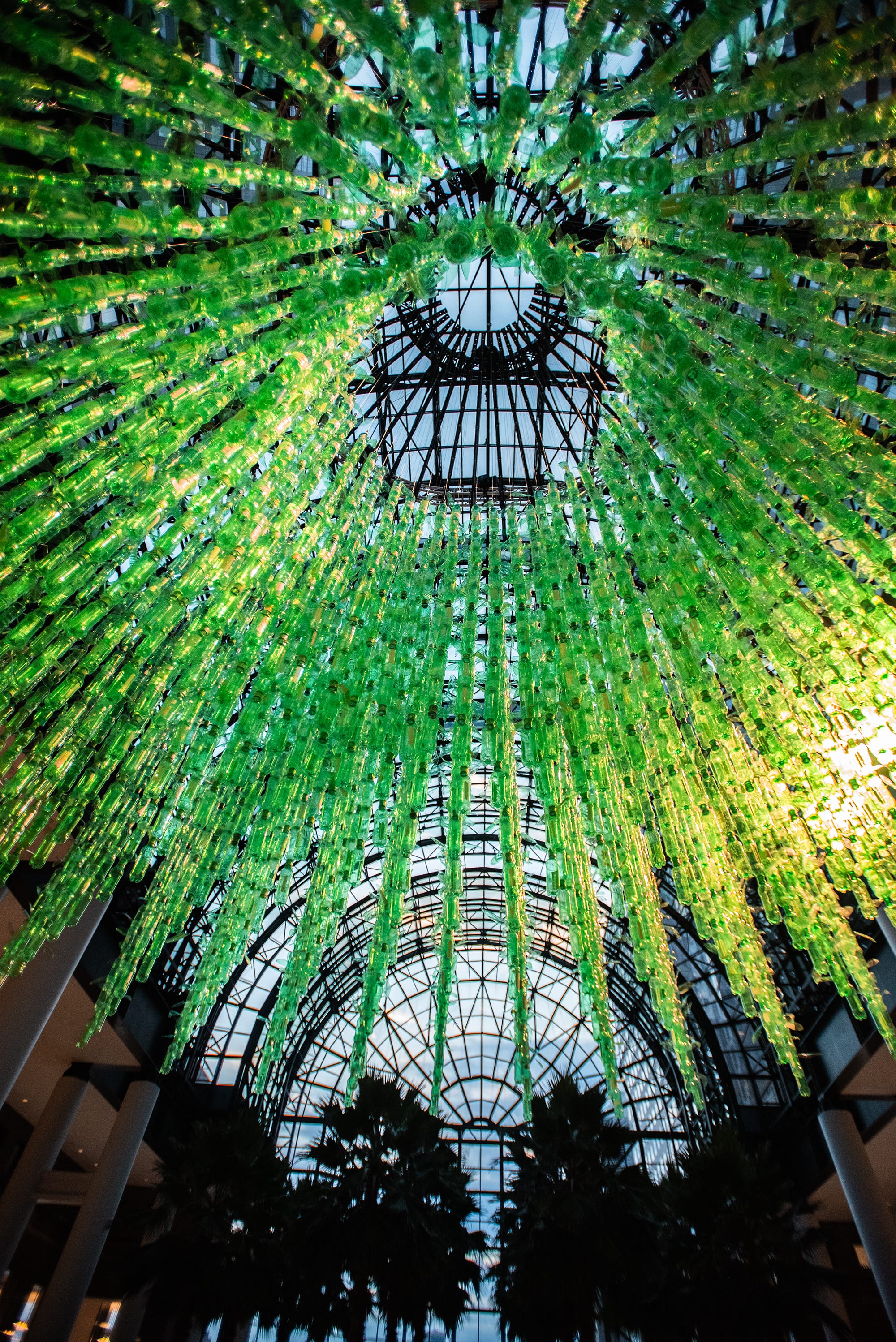 Winter Garden at Brookfield PlaceFloating MAiZE consists of recyclable green plastic soft drink bottles suspended above the grand staircase in the Winter Garden at Brookfield Place, while The Last Straw presents three macro and micro views of plastic waste, featuring different configurations and perspectives of colorful straws and reflective material. Both works encourage viewers to contemplate their own plastic consumption and question the ecological impact of consumer behavior in contributing to plastic pollution.