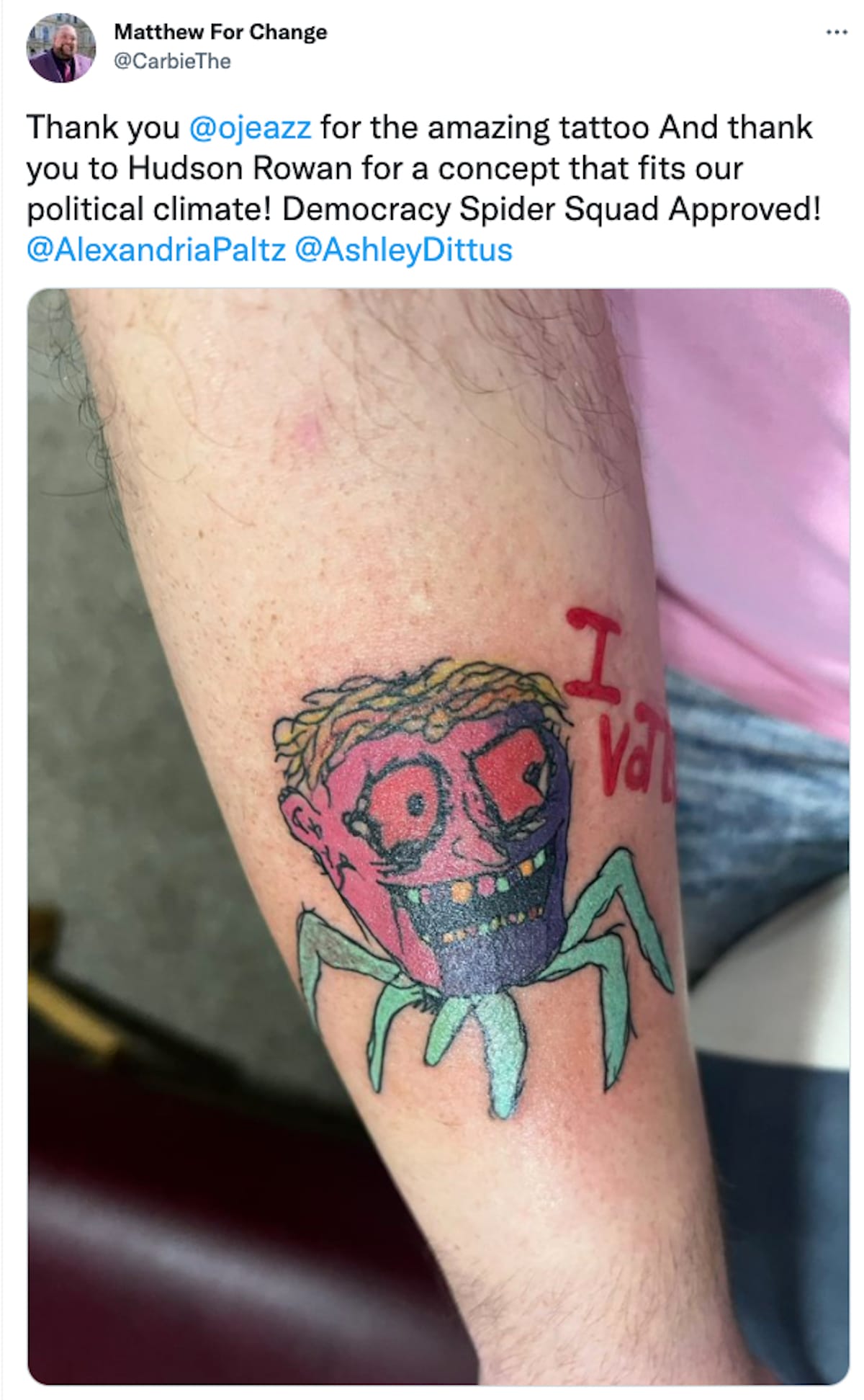 Fourteen-year-old Hudson Rowan's entry for an "I Voted" sticker design contest in Ulster County, New York, went viral last summer, reigniting a voting fervor across the nation during this year's midterm elections. The spider-y character, scribbled in acknowledgment of the chaos amongst us, became an overnight sensation that inspired Alex Wojcik, New Paltz's deputy mayor, to memorialize it on her arm.