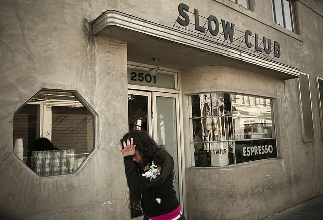 Concrete floors with simple, wood-topped tables and big, exposed earthquake braces at Slowclub in San Francisco face off with a public transit depot like a polemic about how to live better: eat slowfood and take the bus.