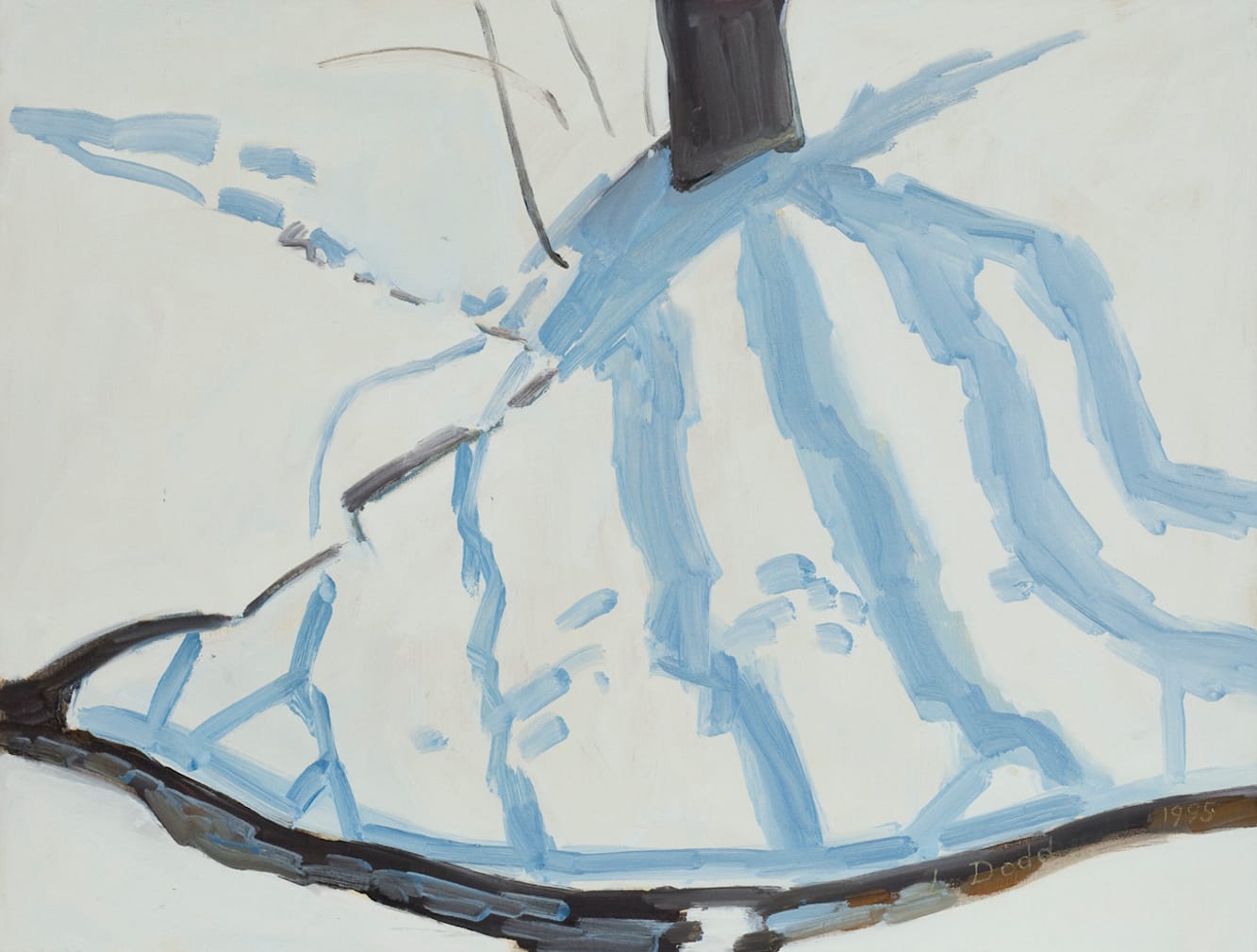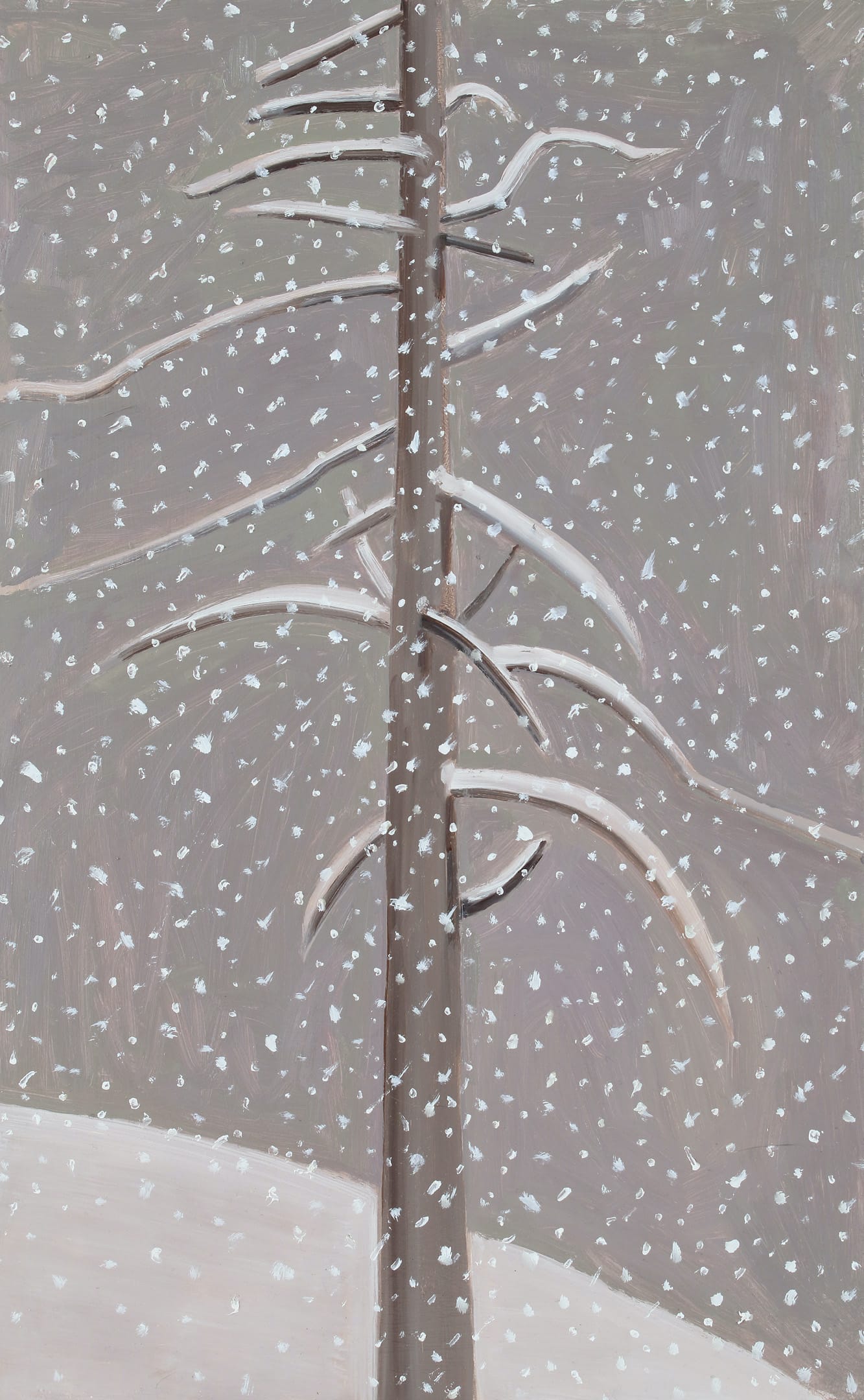 Like this rare self-representation, most of the paintings here were produced en plein air, a way of working inspired by her friend Alex Katz, who would go out on painting forays during the decade Dodd co-owned a house with him and his then-wife, the artist Jean Cohen, in Maine. Dodd has always referred to nature in her works, even in those completed early on, based on drawings. Once she stepped outside to paint, however, she never turned back. No longer, as she maintains, did she have to strain for a subject; no matter how complex the scene, she found the point of view that allowed her to summarize and abstract the essentials. And so it has gone, to the point of such remarkable consistency that it is a challenge to consider her art in a strictly chronological order — although she has tended toward increasing distillation, the elimination of all unnecessary details, as she ages. The show’s most recent work, the small “Tree in Snowstorm” (2021), its dun palette as unassuming as its subject, is a single bare tree accumulating the flakes that fly all around, expressing solitude and simple, mute eloquence in equal measure.