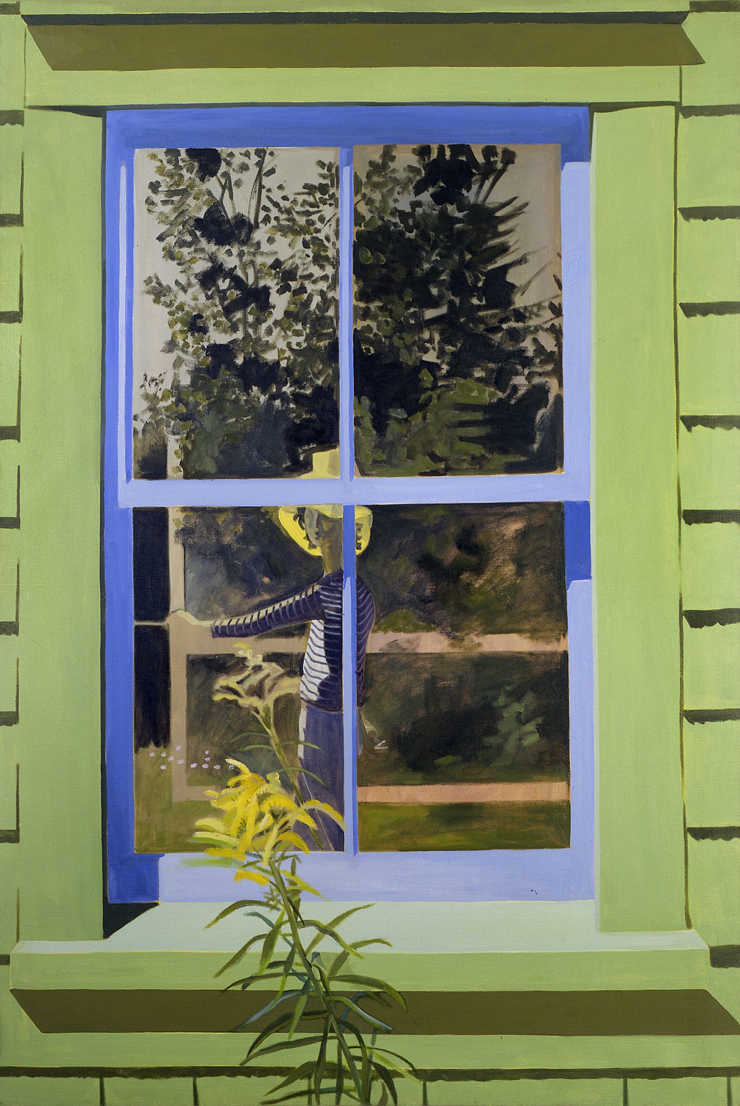 Dodd prefers surfaces with little give — for some of the large works, it is linen stretched taut. Smaller works on Masonite were completed in one shot, before light and atmospheric conditions could change too much, but some of the larger works, as in a series done in the woods, were painted over days, compelling her to strap her canvas to a tree, cover it, and return repeatedly until it was done. Among the most striking series are her windows, which she began painting in Maine in 1968 and proved enduring as a subject. Struck by what she terms our “American ruins,” exemplified by abandoned farmhouses and outbuildings, she found herself fascinated by the combination of gridded structure and reflective happenstance in their broken windows. In “View Through Elliot’s Shack Looking North”(1971), we see simultaneously what is behind us, on the surface, and within or beyond, glimpsed through a broken window on the opposite side of the shack. It all gets flattened in the picture plane. Especially noteworthy here are “Barn Window and White Square”(1981), with its rhythmic geometry, and “Self Portrait in Green House Window”(1971), on loan from the Portland Museum of Art. In this, one of her very few self-portraits, she depicts herself in communion with a cheerful goldenrod. She must have been reflected often in the windows, but she studiously excludes herself most of the time; she paints what she sees, but selectively, after all.