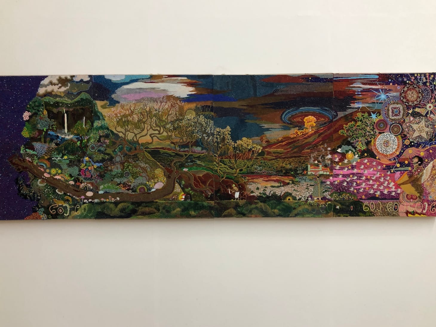 Anjum Rizvi’s creative process is inspired by a combination of Mughal and Persian miniatures. The intricate images transport the viewer into a fantastical world, enhanced by a touch of abstraction. Rizvi uses beads, jewels, textiles, paint, and fabric liners to achieve the rich textures and colors. Approaching his art with the precision of a miniaturist, his imaginative, meticulously detailed compositions are a pleasure to see up close.