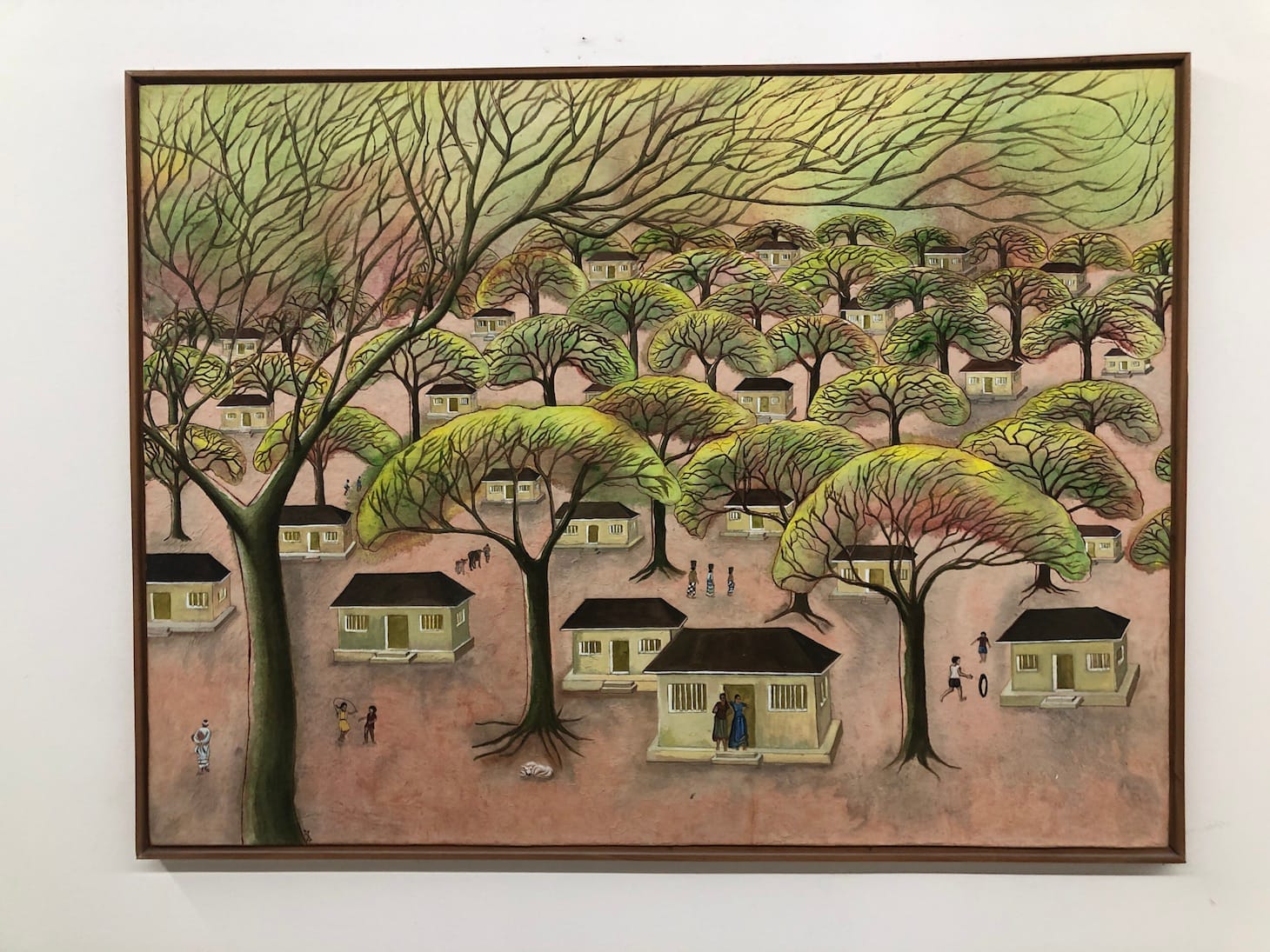 Santhi EN’s paintings revisit her childhood, with quiet scenes of children in a village playing games, like hide and seek and hopscotch, or leisurely reading amid the palm trees. The Thrissur-based artist explores the pandemic through motifs like the resilient cacti and thin tree branches, which are a symbol of new life. Her detailed clouds, plants, and young children, and the muted color palette, make this artist’s body of work one of our favorites from the show.