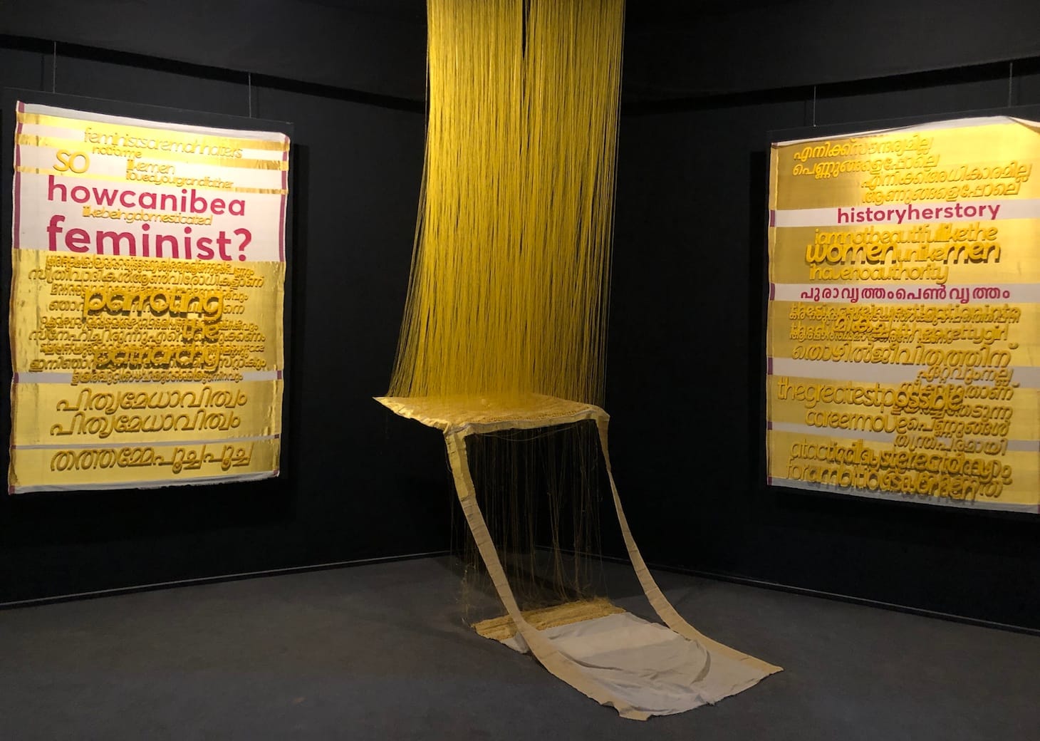 Mumbai-based artist Lakshmi Madhavan threads her way toward home in her installation Hanging by a Thread, which merges textiles and wordplay in English and Malayalam, tracing her roots through the contours of language. Using the woven panels of kasavu mundu, the traditional fabric of Kerala, she reveals a woman's inner thoughts on nostalgia, identity, freedom, belonging, and patriarchy in an inconstant world. The work creates a sense of intimacy almost like talking to a close friend.