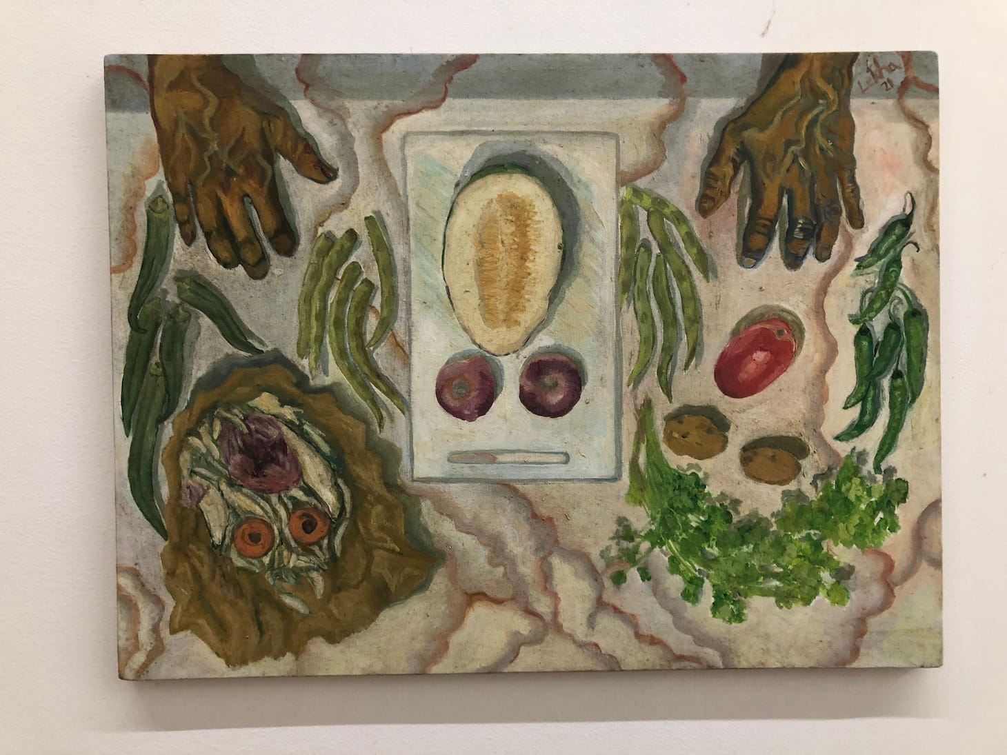 One of the most playful and engaging bodies of work in the show was Ernakulam-based Lekha Narayanan’s. Her oil on canvas paintings playfully merge food and face pareidolia (the phenomenon of seeing human faces in inanimate objects), and drew some chuckles from the attendees. They could also be perceived as an existential expression of the isolation and distorted realities caused by COVID-19 lockdowns, as many of the faces appear to be screaming. More amusingly, they can be seen as a refreshing comment on the resurgence of home cooking during the pandemic, and how food can become visual fodder for an artist.