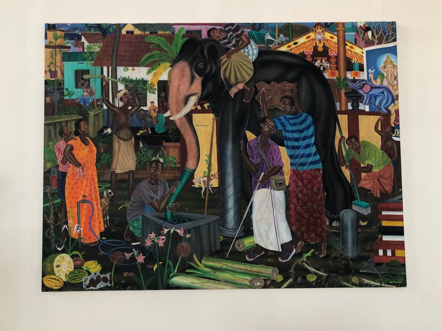 One of the most thought-provoking works in the show was this satirical painting by Rejeesh Sarovar, an artist living in northern Kerala who survives on agriculture and fishing. He offers his own rendition of the famous blind men and elephant story, and reflects on how human actions have impacted nature in the work. A pipe replaces the elephant’s trunk, a broom replaces the tail, visually conveying the exploitative relation between man and nature.