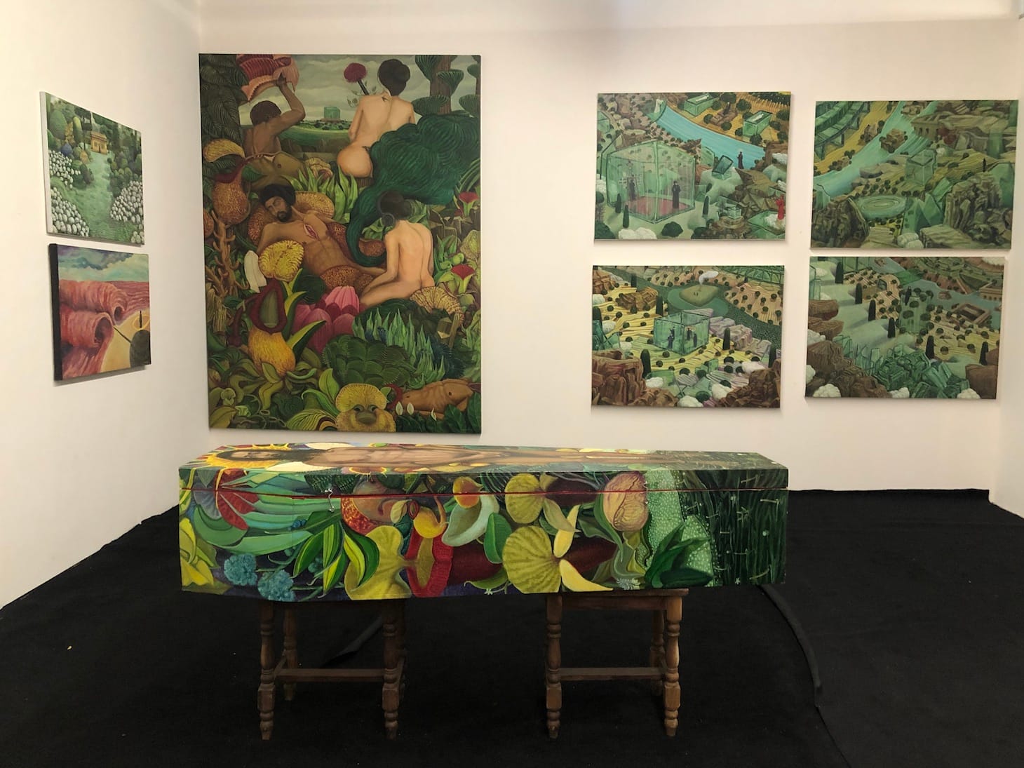 Dreadful Days is a series of stunning paintings by Thiruvananthapuram-based artist Tito Stanley. Tension, pain, fear, and loneliness are palpable in these hallucinatory paintings, created in 2020, when quarantine measures left the artist stuck in his house, living with his parents. The paintings also evoke nostalgia and reflect a desire for shelter, as Stanley sought to capture scenes from his childhood — for instance, the family’s garden, filled with flowers and butterflies, and his mother’s chicken coop. A painted coffin reminds the viewer that these works were made amid the death and loss of the pandemic.