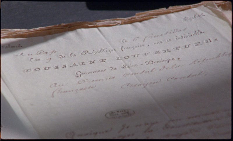 After observing his handwritten memoirs in the French National Archives, Ouvertures follows the ghost of Toussaint L’Ouverture, a leader in the Haitian Revolution, as he travels from the prison cell in the Jura mountains where he spent his final days to present-day Haiti. There he encounters the Living and the Dead Ensemble as they attempt to “creolize” Monsieur Toussaint, Édouard Glissant’s 1961 play about his death. Combining footage of their rehearsals with images of locations in Port-au-Prince where the revolution took place, the film is a powerful example of self-emancipation through translation.