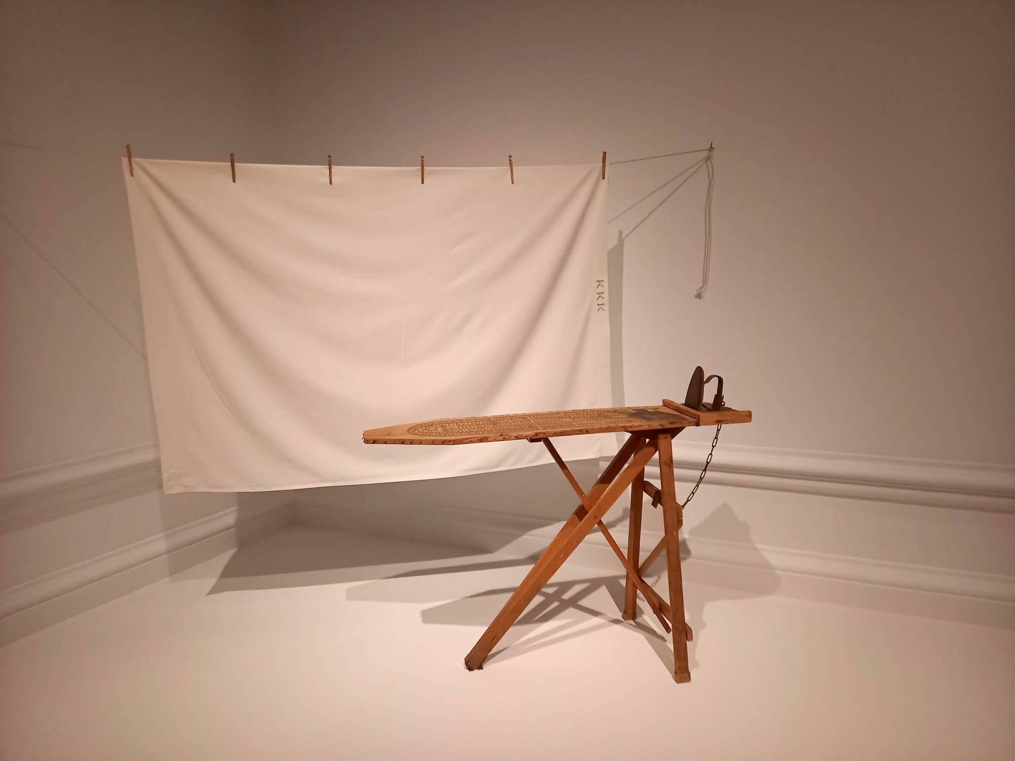 The academic rigor of the captions is counterbalanced by the poignant responses by contemporary artists and some astonishingly inspired curating. In “Constructing Whiteness,” white walls ingeniously link to the text conceptually, explaining the extent to which the British cotton economy relied on the labor of enslaved people in the Southern United States. Nearby is LA-based artist Betye Saar’s "I’ll Bend but I will Not Break" (1998), an iron shackled to an ironing board bearing an 18th-century diagram of the British slave ship Brookes, behind which is a cotton sheet bearing the Ku Klux Klan symbol.