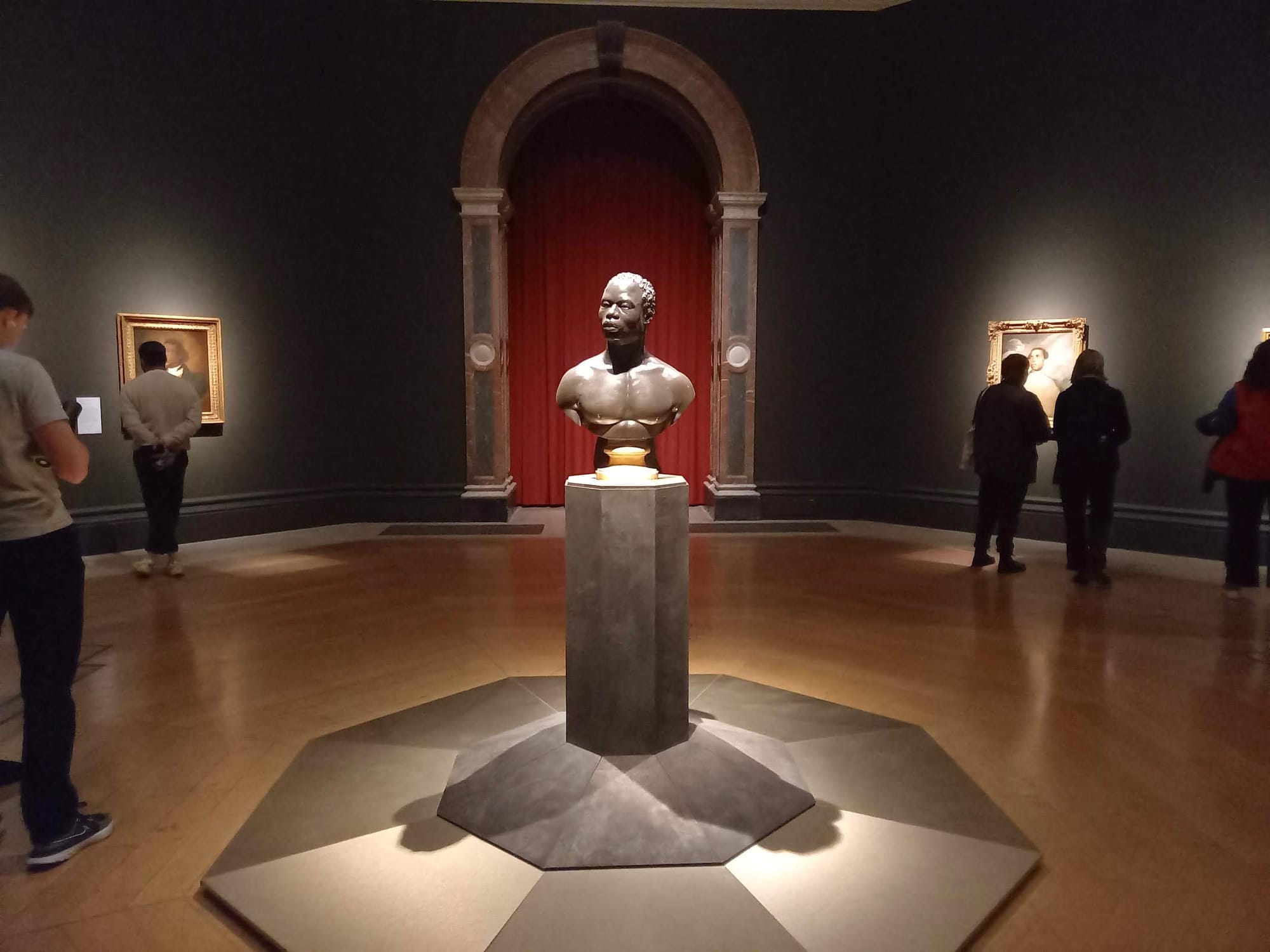 At the room’s center is a classicized bust of an unknown Black man (1758) by Francis Harwood. The caption explains how classicism perpetuated the Western canon, but allows the viewer to consider who this man was and what kind of life he led. Was he merely a means for the artist to present British classicist ideals, or did the artist believe he was elevating his subject? How was the audience at the time meant to view the image — as an aggrandizing portrait of a real person or mere “exotic” room decoration? Such questions are raised throughout the show, allowing viewers to come to their own conclusions.