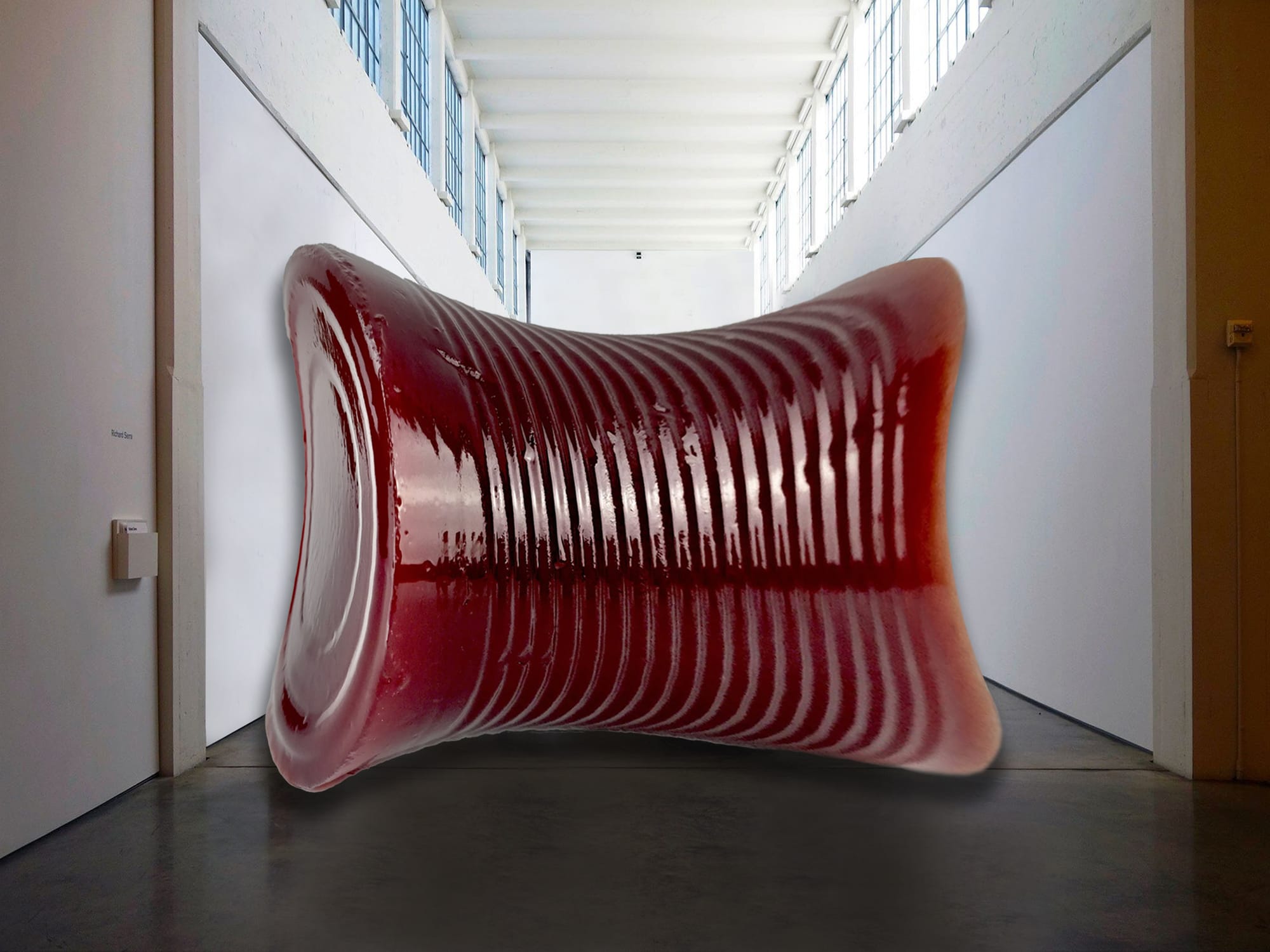 Purchase a 120-foot heavily rusted tin can of cranberry jelly. Cold-roll the sides of the can to achieve a gentle sloping curve on either side before unmolding. Test for doneness by gauging whether the form is sufficiently aggressive and imposing. Hollow a central cavity in the jelly and experience the intimacy and claustrophobia of the cranberry from the inside.