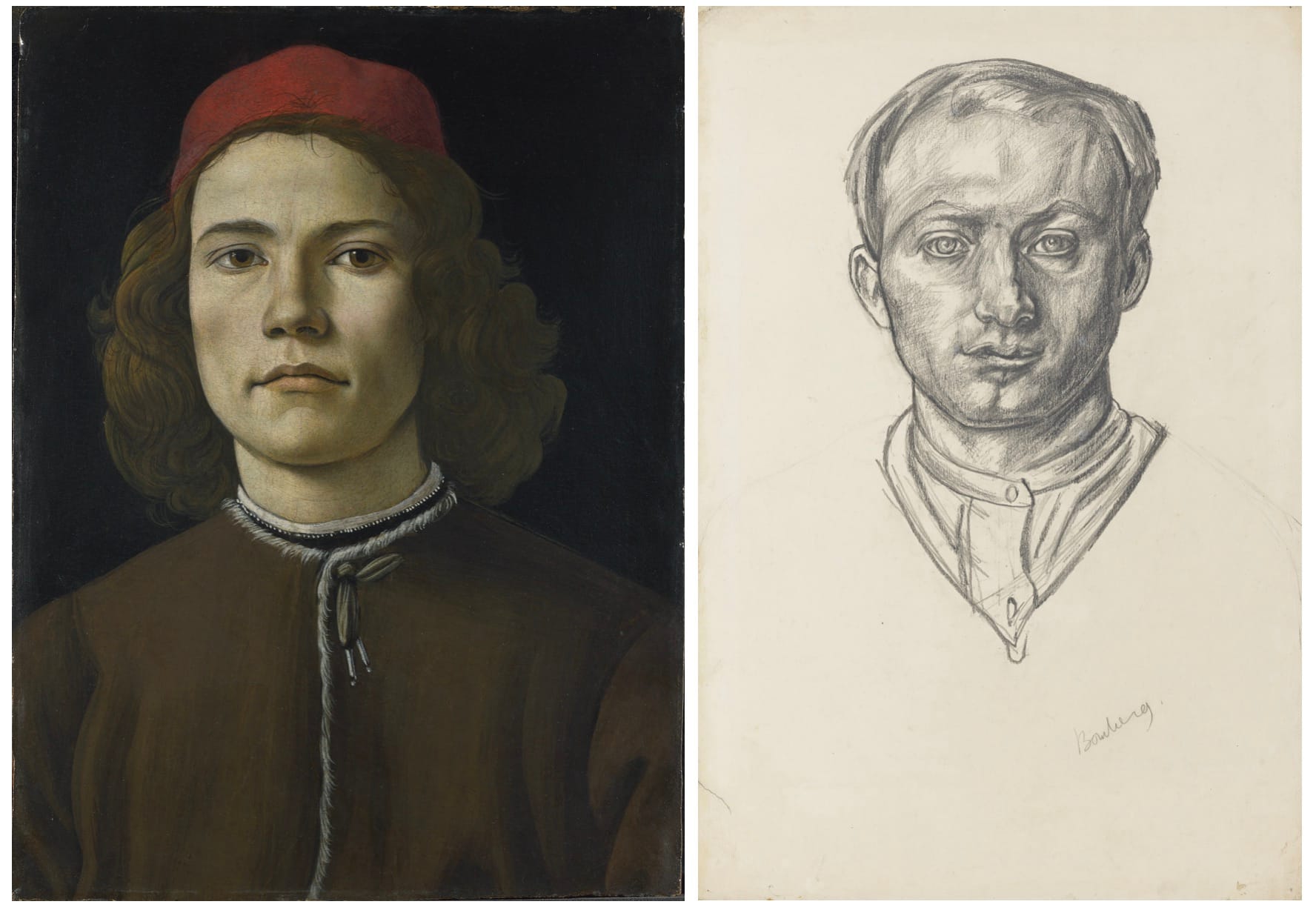 Beside the Botticelli, there hangs a self-portrait by Bomberg. We are encouraged to think about the fact that both portraits are forward-facing, eyes directly engaged with the onlooker, and that Bomberg admired so much the shirt that Botticelli’s handsome sitter was wearing, that he ordered one very similar for himself — and here he is wearing it! These then are the two bits of so called evidence of the influence of the past upon the present, and both are either frivolous or lightweight.
