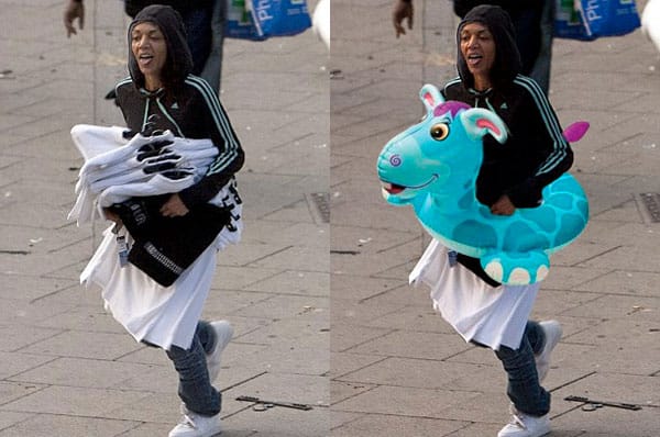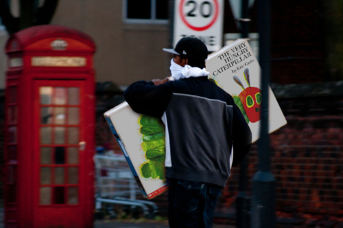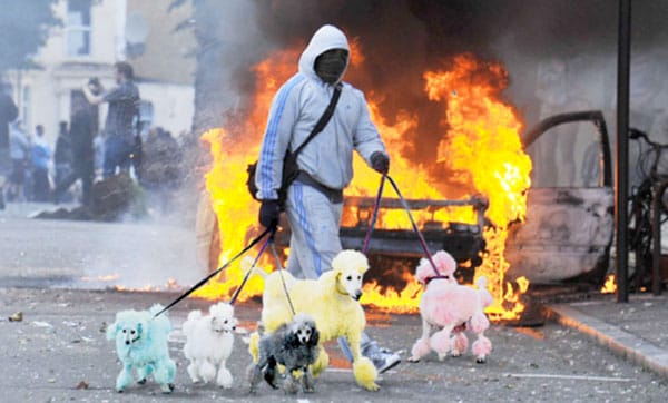 The oft-retweeted Photoshoplooter offers blunt condemnation of the rioters, but without nuanced criticism. Photoshoplooter is a tumblelog featuring doctored photos of people looting, replacing what they have in hand with children’s toys or unusual objects to humorous effect. The apparent point of the tumblelog is to deride looters’ behavior, to expose the sheer ridiculousness of their actions, perhaps to dissuade any potential rioters into looting. Many of the items added in are toys or characters associated with small children, painting a picture of infantile behavior. Alternately, there are also inserts of Justin Bieber posters or frilly tutus in pictures featuring men, which serve to undermine the masculinity of the people shown. In either case, the imagery is decidedly unsympathetic to the appeal that looters might be apart of some disenfranchised “underclass” attempting to assert control in a system that never gave them much agency. The altered photos puncture the power of the riots, reducing the thefts from violent crime to frivolity. Photoshoplooter is not interested in who the supposed looters are — whether they are leading the charge to commit criminal acts or to protest, or are more passive participants or bystanders, or have any non-materialistic stakes in looting. The lines are clearly drawn: there are silly, childlike looters on one side, and on the other: the presumably civilized, adult non-rioters, the people sending in the photo manips.