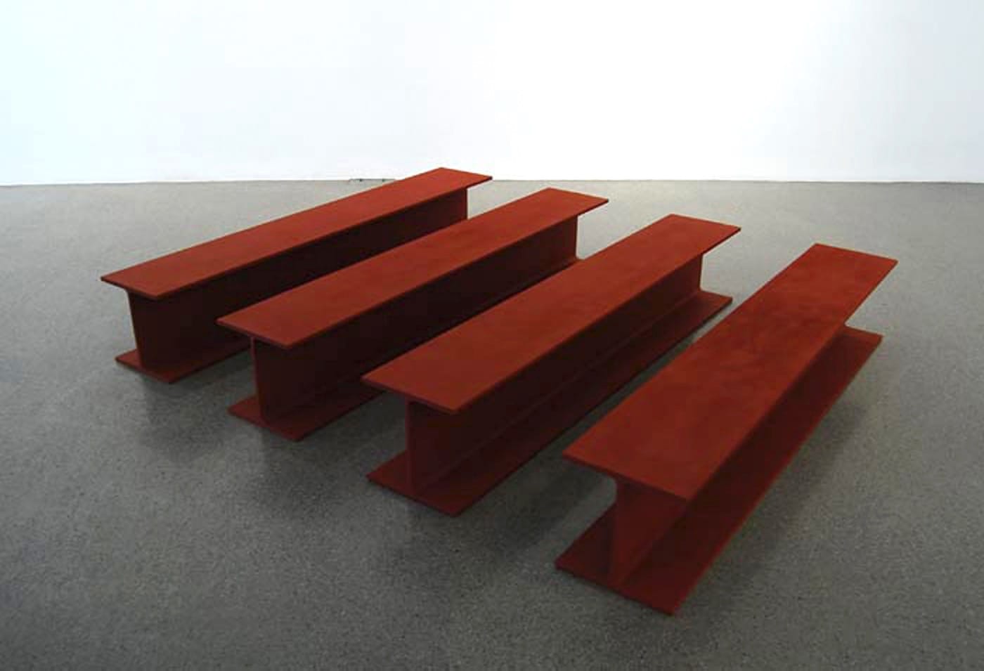The show quickly spins into a retinue of minimalist forms that prove Araeen’s exacting, delicate eye. We see immaculately spaced I-beams painted rust red, a hoard of symmetrical blue boxes gathered on the floor, and a bold diptych of blue and yellow trusses hanging from their opposite-colored canvases. Why these colors? It’s hard to exactly pinpoint, but there’s a special poetry to it. Araeen’s work certainly benefits from close inspection. The trusses, for example, are not as mass produced as they initially appear. These are small painted sculptures that are made out of delicate balsa wood.