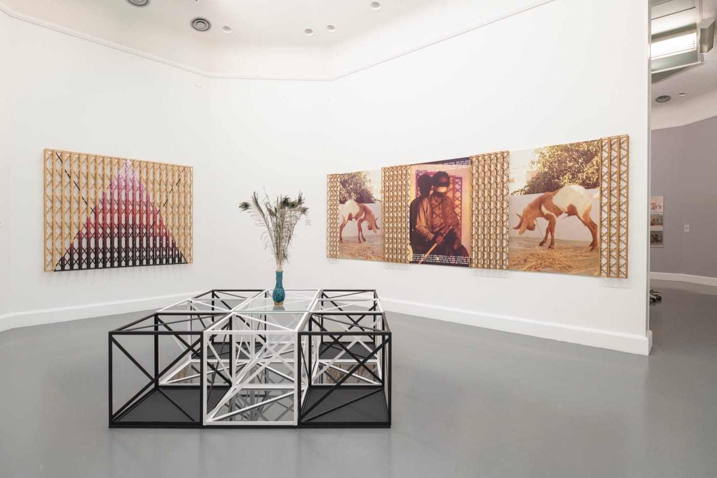 Araeen became a truly exceptional artist in the ‘80s when he begins to mix his minimalist vocabulary with a political polemic. “Sonay Ke Chirya (Golden Bird)” (1986) is probably the best example of this genre of work. Araeen created a multimedia installation with an image of a sultry white woman with blonde hair at the center. Constructed like a triptych altarpiece, the woman is flanked by the images of a goat falling in midair — complete with bright red skyward erections. Below this collage is an evolution of Araeen’s earlier truss-work. Here — and in later works — Araeen uses the truss pattern as a mesmerizing kaleidoscope, shifting its colors and patterns as the viewer walks by. It’s a disarming visual spectacle that reinforces the sense of play implicit in all of Araeen’s art.