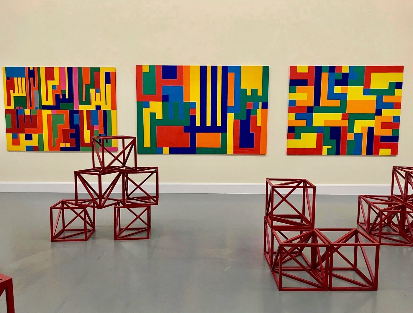 Although disabled by a recent stroke, Araeen continues to make work with the help of an assistant. Gone are explicit, vehemently political actions. Instead, he has returned to a brightly chromatic conceptual approach. Today, Araeen seems more focused on creating zones for communal meditation than political critique. (Maybe they are one in the same?) The final room in his exhibition includes those same symmetrical blocks from the ‘60s — only now you are encouraged to play with them. I saw adults and children at the show building pyramids and doorways. On the walls of this room, curator Nick Aikens has paired more of Araeen’s trusses with simple painted canvases. Abstrusely labeled with titles like “Opus F4,” these hyper-flat, blocky patterns freeze the artist’s kinetic truss patterns in stasis. In context of Araeen’s much louder political works, I think these quiet yet mesmerizing pieces present an unexpected coda to the artist’s career survey. In a clamorous, politically loathsome world, creating moments of quiet for communal reflection is itself a radical act.
