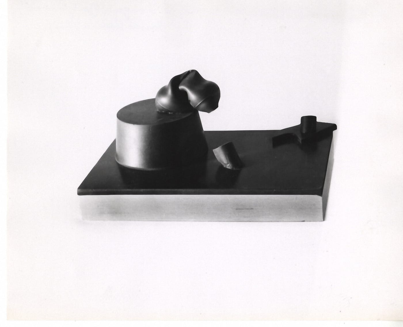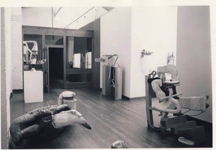 Despite the diffuse nature of funk, Selz takes a page of his essay to explore the pedigree for the show’s eponymous attitude. Marcel Duchamp’s readymades as well as the works of Jean Arp, Joan Miró (especially “Object” from 1936), and Méret Oppenheim are each singled out as possible prototypes, or distinct examples of funk. Selz continues by citing recurrent themes in funky art, especially: private metaphor, self-deprecation, “erotic and scatological” motifs, ambiguous intent, and moral ambiguity. Selz emphasizes this last point by opening the catalogue with a quote from The Bald Soprano (1950) by the absurdist playwright Eugène Ionesco:
