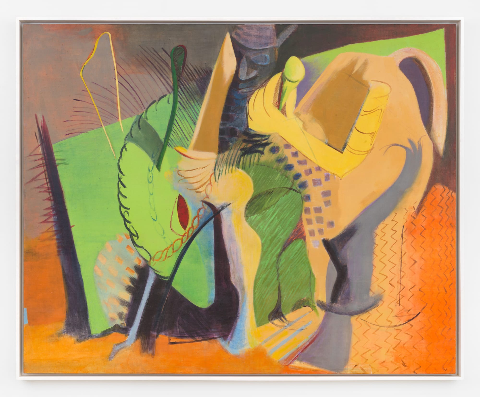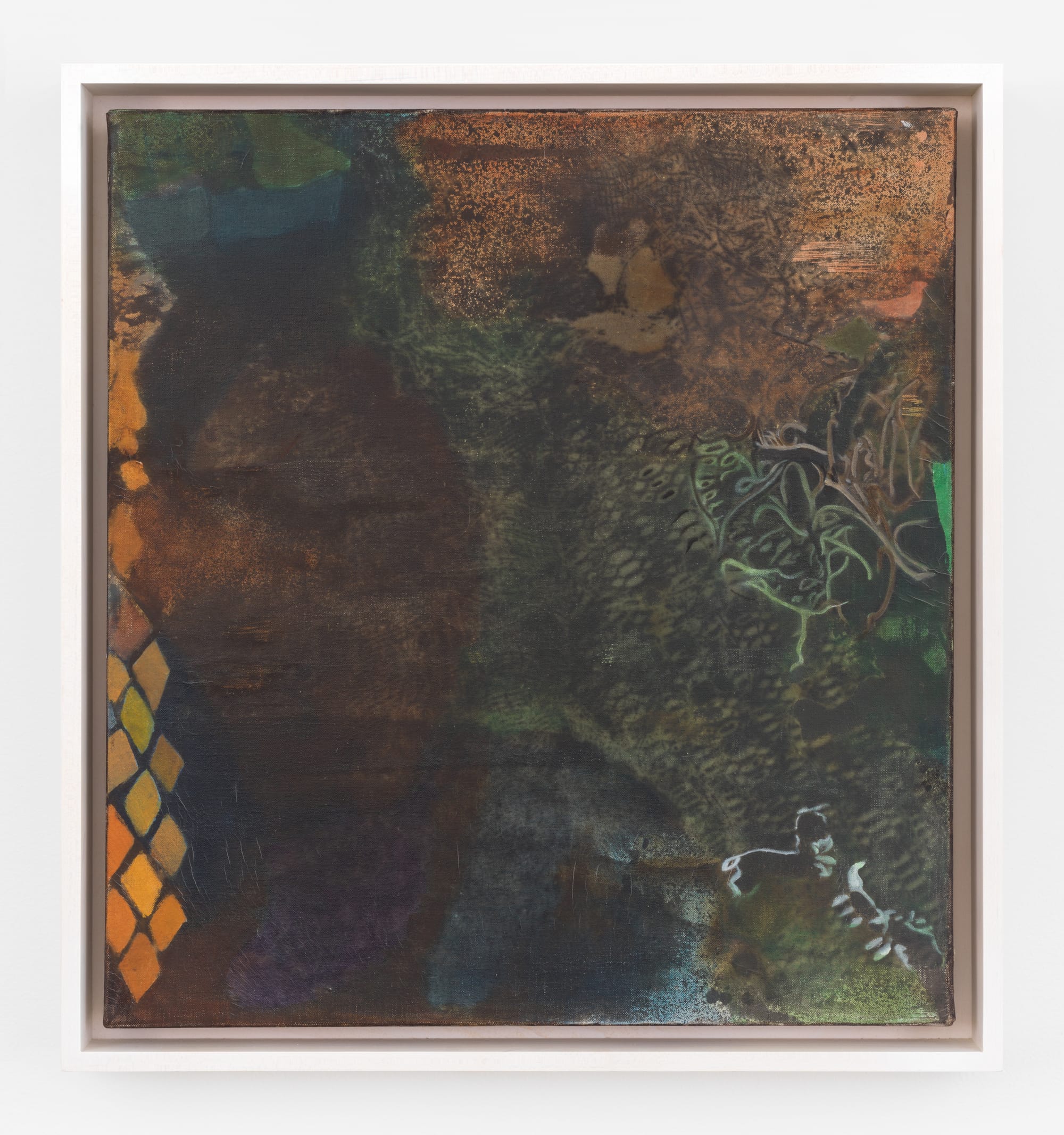 Anticipating the portrayals of trees that would occupy the artist in her last decade, flora and fauna abound. Vegetation Browne encountered appears in various forms: as a repeated, decorative leaf motif in “Diversities” (1973), energetic arched lines in “Umbrella Plant” (1971), and flat green blocks in “Shango Kingdom” (1972). In “Abstract Forest” (1974), an oil painting that is smaller in scale and darker in hue than its acrylic counterparts, an enigmatically crepuscular, loosely patterned, all-over green-brown murk is peppered with errant vines; to the left of the frame, a strip of orange diamonds reads as reptilian, evoking vipers and adders. Notions often tied up with landscape painting — from the espousal of manifest destiny to the imposition of an exoticizing vision — are absent here. Instead, this quietly inexhaustible little painting is a rich terrain in which to lose oneself.