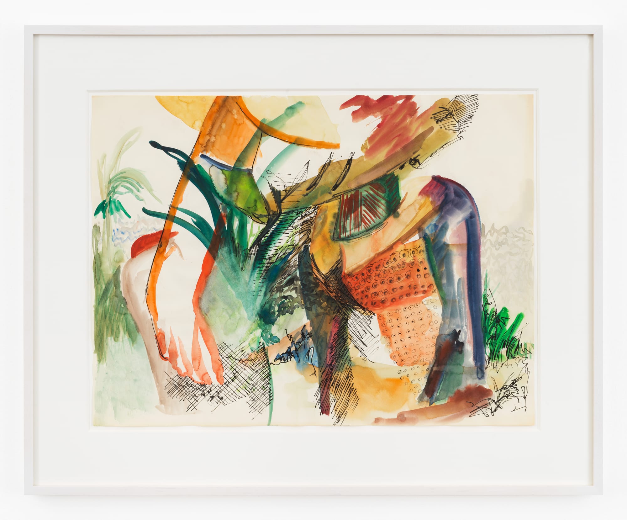 Bodies don’t disappear in these works, but rather materialize in many guises, from a trio of readily identifiable planar women in “The Bathers” (1971) (likely a nod to Paul Cézanne, whom Browne greatly admired) to a gallimaufry featuring a mask-like face, disembodied arm, chartreuse phallus, and fragmented horse in the large-scale “Assistant to the Chief” (c. 1973), to a swooping orange C-curve with an otherworldly single eye in another sizable acrylic, “The Chiefs Attendant” (c. 1972). Browne had already established herself as a colorist, but in the Africa series, she introduced an even bolder palette. While the drawings and etchings on display, including the grayscale gouache and ink depiction of bathers, are relatively subdued in tone, the paintings are shot through with fuchsia, lime, papaya, and aquamarine hues; often, she opted for acrylic instead of oil so she could paint at a faster pace. Irrespective of media, patterns blossomed: works on view teem with swathes of zigzags, wavy lines, polka dots, tiles, and even irregular rows of what resemble tiny eyes, hinting at the depth and breadth of visual stimuli that Browne experienced on her travels.