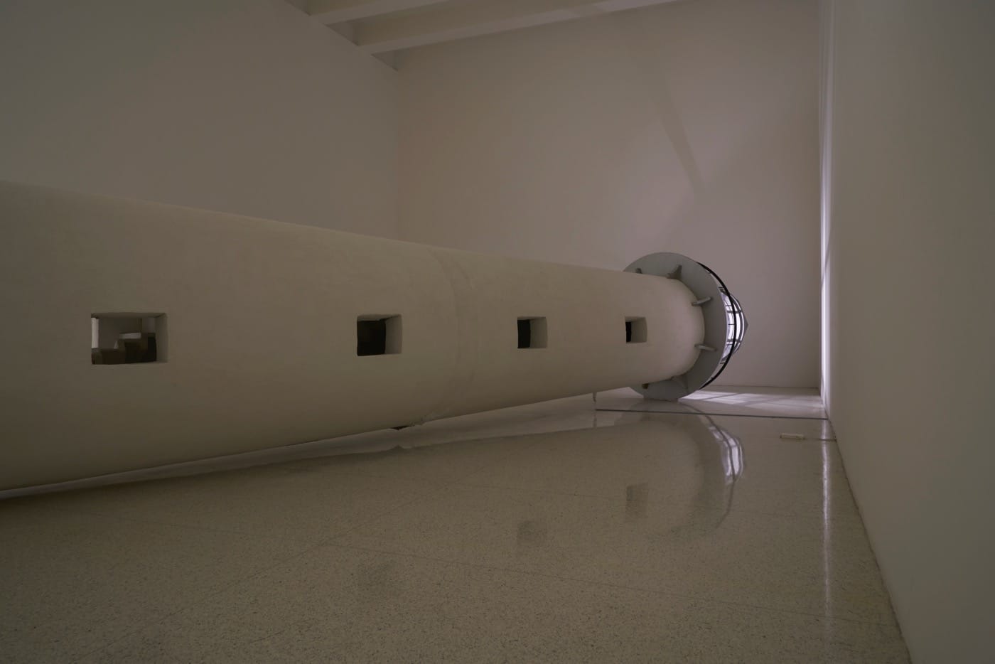 The final constellations are dominated by work from the past twenty-five years, from the Special Period to the post-ideological present. Two signal exceptions date from the 1960s, both in the Sea, Borders, Exile section: José A. Figueroa’s rending photograph “Olga” (1967), in which the separation of exile is telescoped in the distance between hands waving farewell at Havana’s airport; and Luis Martínez Pedro’s untitled paintings (1963) from the Territorial Waters series, which transfigure concrete aesthetics into geopolitical premonition. The geographical circumscription of Cuba preoccupies this gallery, specifically in regard to the exodus of the 1990s (earlier-generation exiles are absent, and in places missed). “Utopia was over,” quips de la Nuez in the exhibition’s catalogue. “Diaspora began.” A raft formed by textbooks, Kcho’s “Selected Works” (1994) nourishes the balsero’s mind (not his body). The dramatic “Felled Lighthouse” (2006), by Los Carpinteros, allegorizes the fall of power.