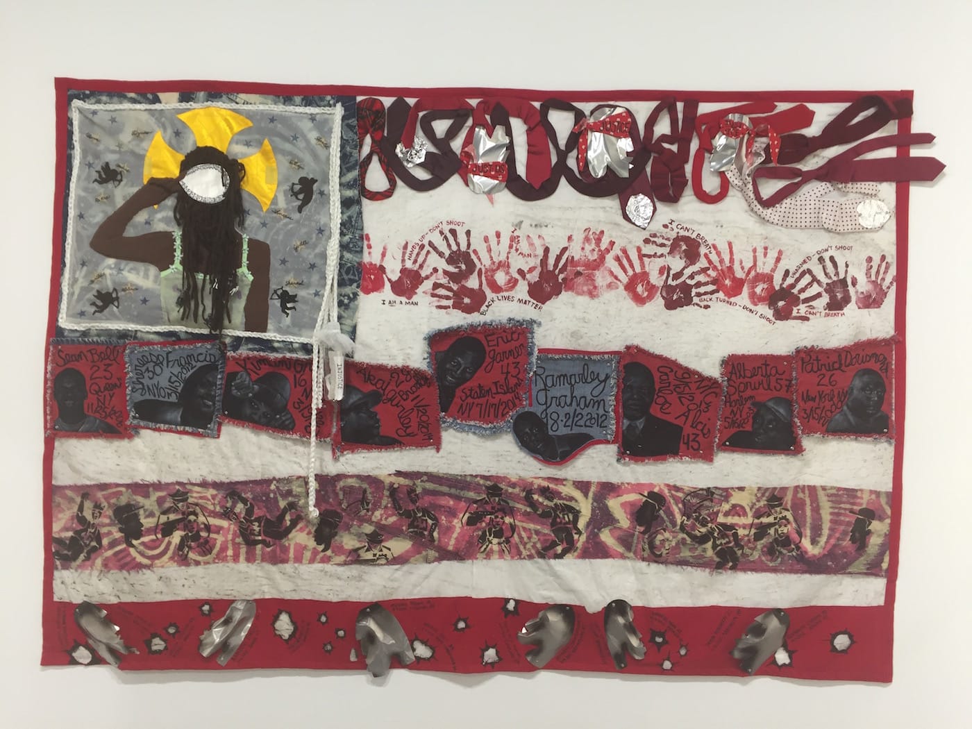 “Look for America” at Art Basel and you’ll find it: at Mendes Wood DM, Paulo Nazareth’s resin boxes, “produtos de geneocídio” (2017), contain products like “Cherokee” beer, Aunt Jemima syrup, and packages of rice emblazoned with images of unnamed First Nations men. Teresa Margolles’s “american Juju for the Tapestry of Truth,” at Galerie Peter Kilchmann, made in collaboration with members of the Harlem Needle Arts Cultural Arts Institute, is a flag dedicated to the lives of black men who died too soon and without justice, like Eric Garner and Carlos Alcis.