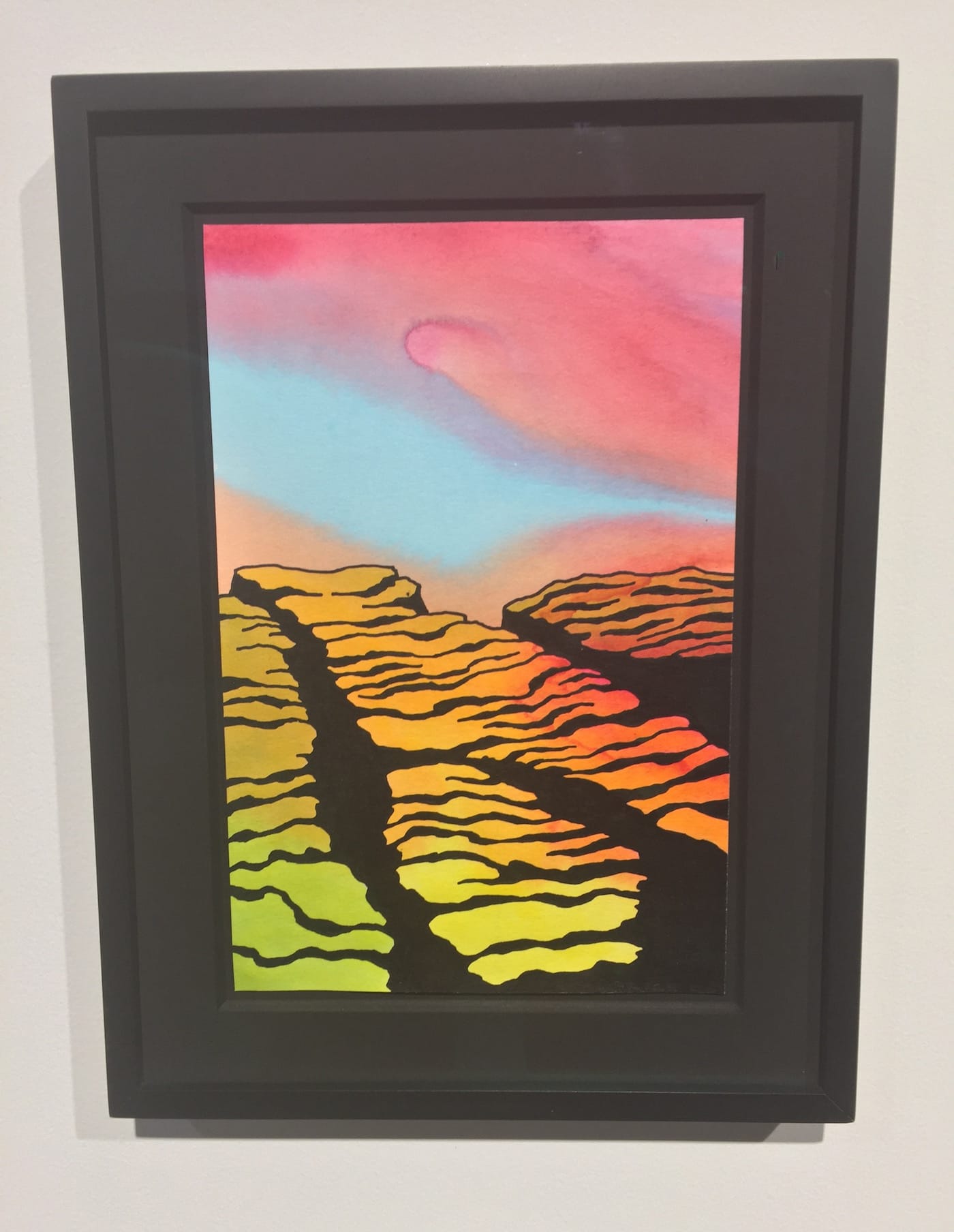 But once inside, I was surprised — even relieved. When I saw a row of small acrylic and ink works by Ken Price, his American landscapes in bright, psychedelic colors, I embarrassingly couldn’t get Simon and Garfunkel’s 1968 hit “America” out of my head. It was hard to look at his uncanny deserts and hills without thinking of Trump’s reduction of Bears Ears and Grand Staircase-Escalante, and of the institutional disregard for the planet. They felt like retrospective memorials to these majestic spaces: “I’m going to look for America.”