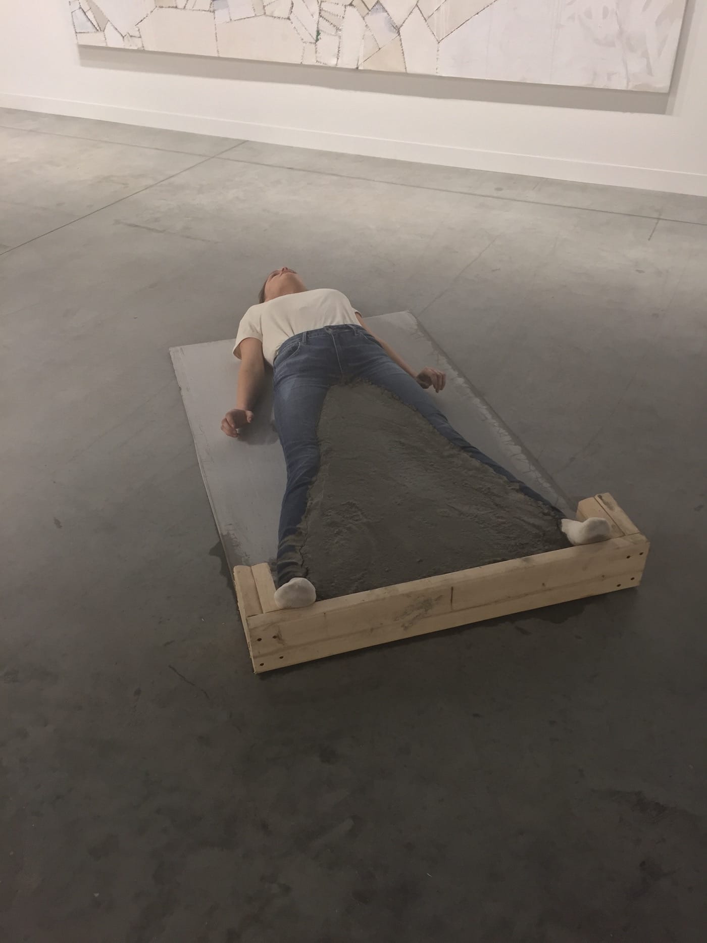 On the day I visited the Fergus McCaffrey booth, the Irish-American artist, Máiréad Delaney, sat atop a flat plinth, a triangle-shaped hunk of wet cement drying between her legs. She occasionally lay down as passersby stared. In five hours, when the cement eventually dried, it became a sculpture to be sold. But watching this strained pain caused discomfort in my own body, especially given Delaney’s stoic, barely wincing expressions. The durational performance, “Stoppage I and II” (2017), refers to the oppressive forces that literally obstruct women, controlling their womb and ability to move. The cement protects and occludes Delaney’s body at once.