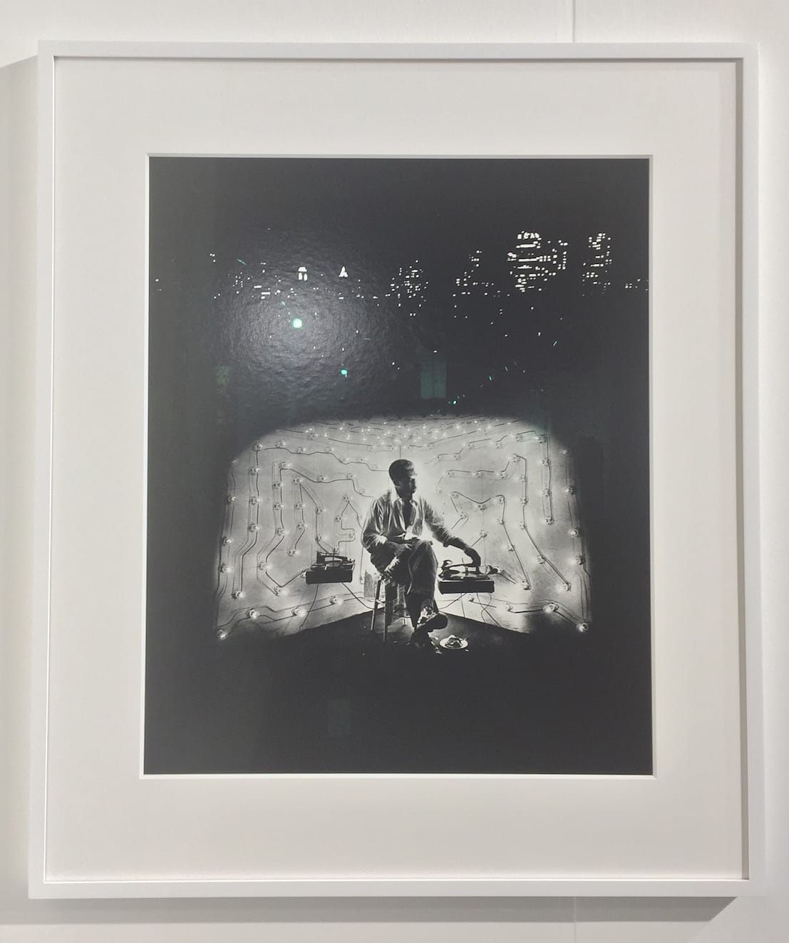 Back at Jack Shainman, in Gordon Parks’s photograph, “Invisible Man Retreat, Harlem, New York” (1952), a man sits in the center of a room, its walls decorated with lightbulbs in a mosaic pattern; in between two record turntables that seem to float, he sits with his legs crossed and, upon first glance, appears to be floating himself. Ironically, he’s shown below a cityscape, living underground. The photographer’s visual interpretations of Ralph Ellison’s Invisible Man are eerie and supernatural, and dark in a way only Parks could be — not macabre, but melancholic.
