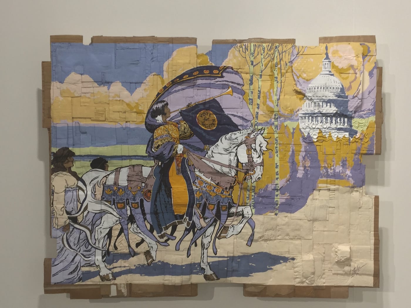 At Andrew Kreps Gallery, Andrea Bowers’s drawings inspired by political posters reference the seeds of this oppression, and also how black and trans women are erased from contemporary women’s justice movements. In the country’s collective memory of the fight for women’s rights, black women, it seems, are often forgotten. Homage to figures like Ida B. Wells, Shirley Chisholm, Fannie Lou Hamer, and their ilk feels sparse. Bowers’s colorful posters feature only black and brown women and girls, holding signs reading “Transfeminism” and “Vote for Women,” or astride horses outside the Nation’s capital.