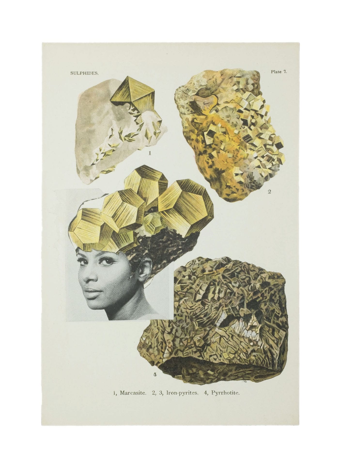 In an interview with the Paris Review, Simpson explained that her interest in found images came from “a discovery I made of these old Ebony magazines belonging to my grandmother. I found them really satisfying to look at, because they’re so contextual … For me, the images hearken back to my childhood, but are also a lens through which to see the past 50 years in American history.” There’s a real joy to be gleaned from the collages, the near-tenderness with which Simpson adorns her subjects. In “Earth & Sky #38” (2017), a woman’s bouffant has become a block of asphalt, and she gazes toward a honeyed amber rock. I know this because, in Earth & Sky, in which hair becomes stone, Simpson has left the captions or numerical codifications for each gem. “Earth & Sky #32” (2016) features a woman in a Grecian dress that doubles as a hood; it’s not her hair but her backdrop that’s crystallized and glowing (fluorite, actually).