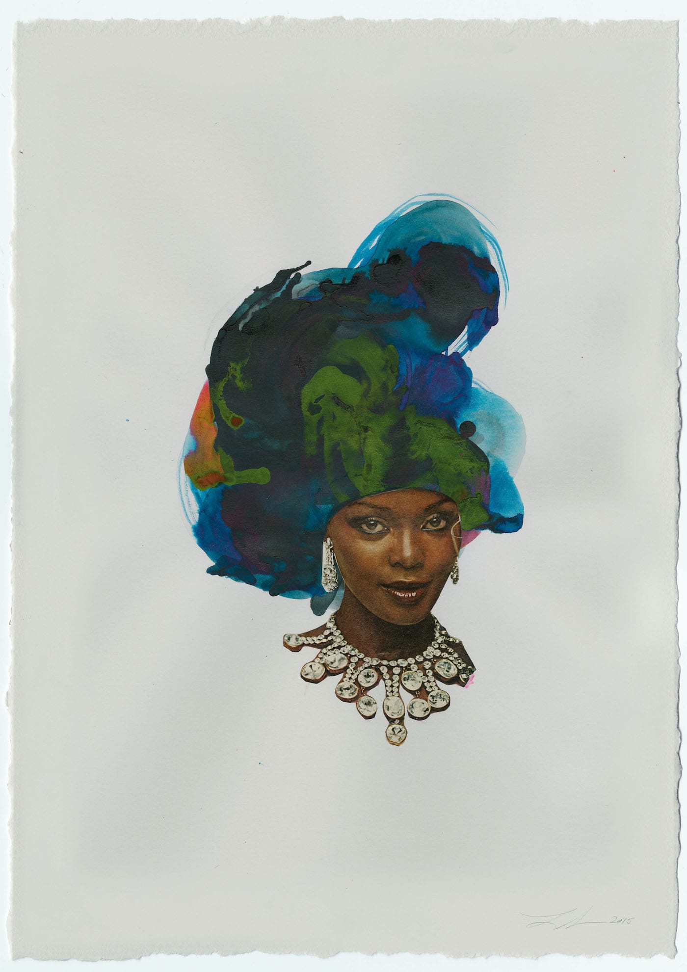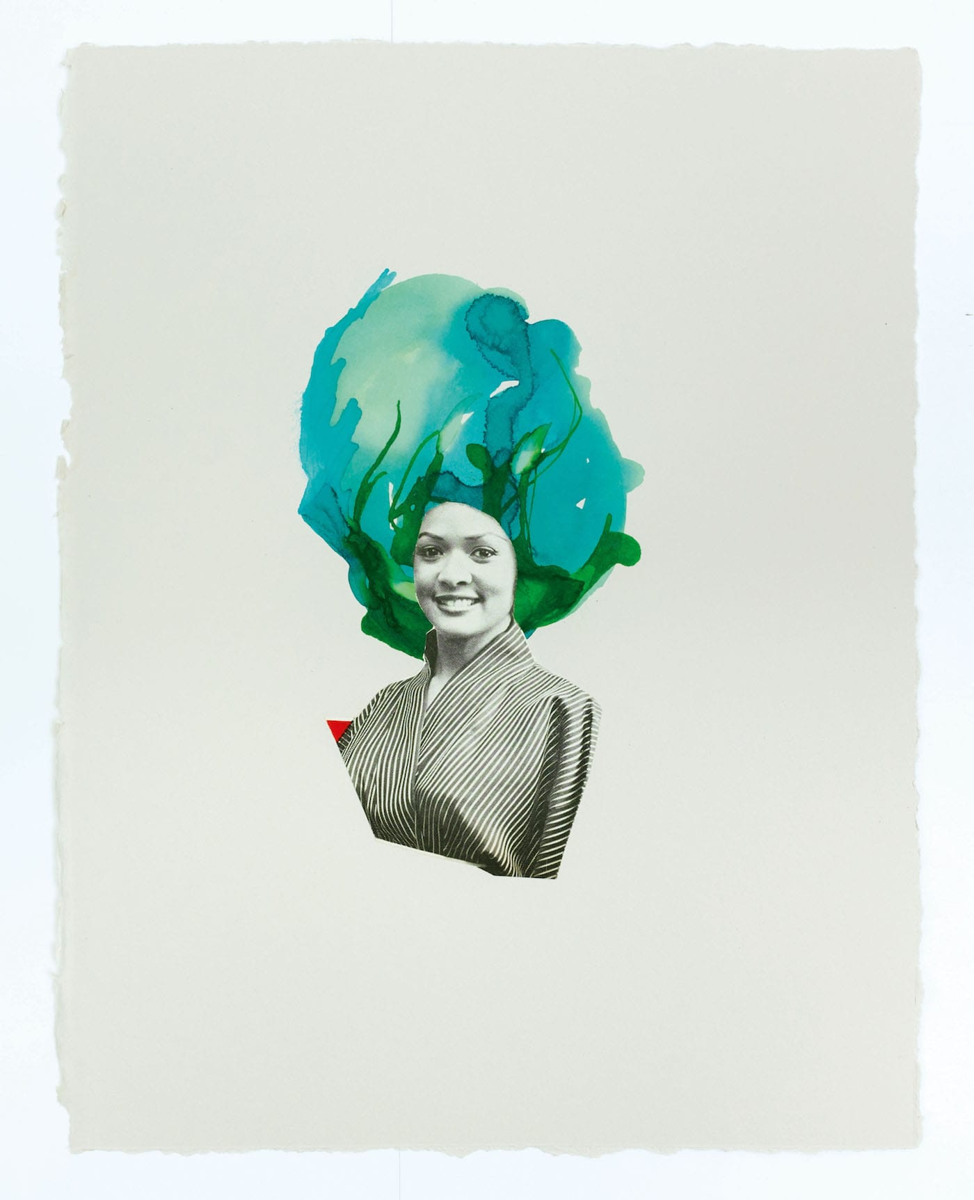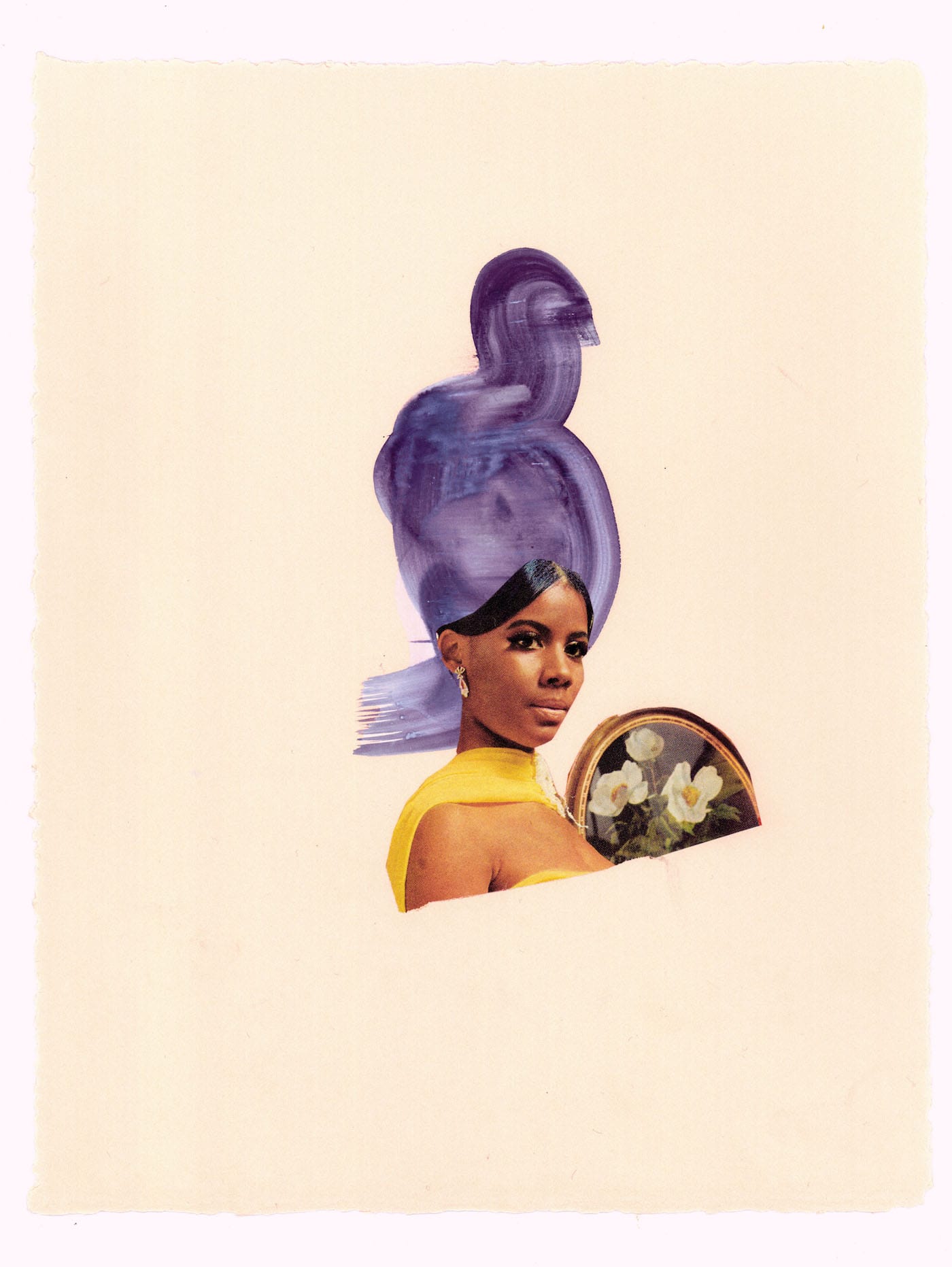 The artist's collages feature portraits of women cut from advertisements, their tresses painted and collaged into pools of color that spread onto the page like oil spills.