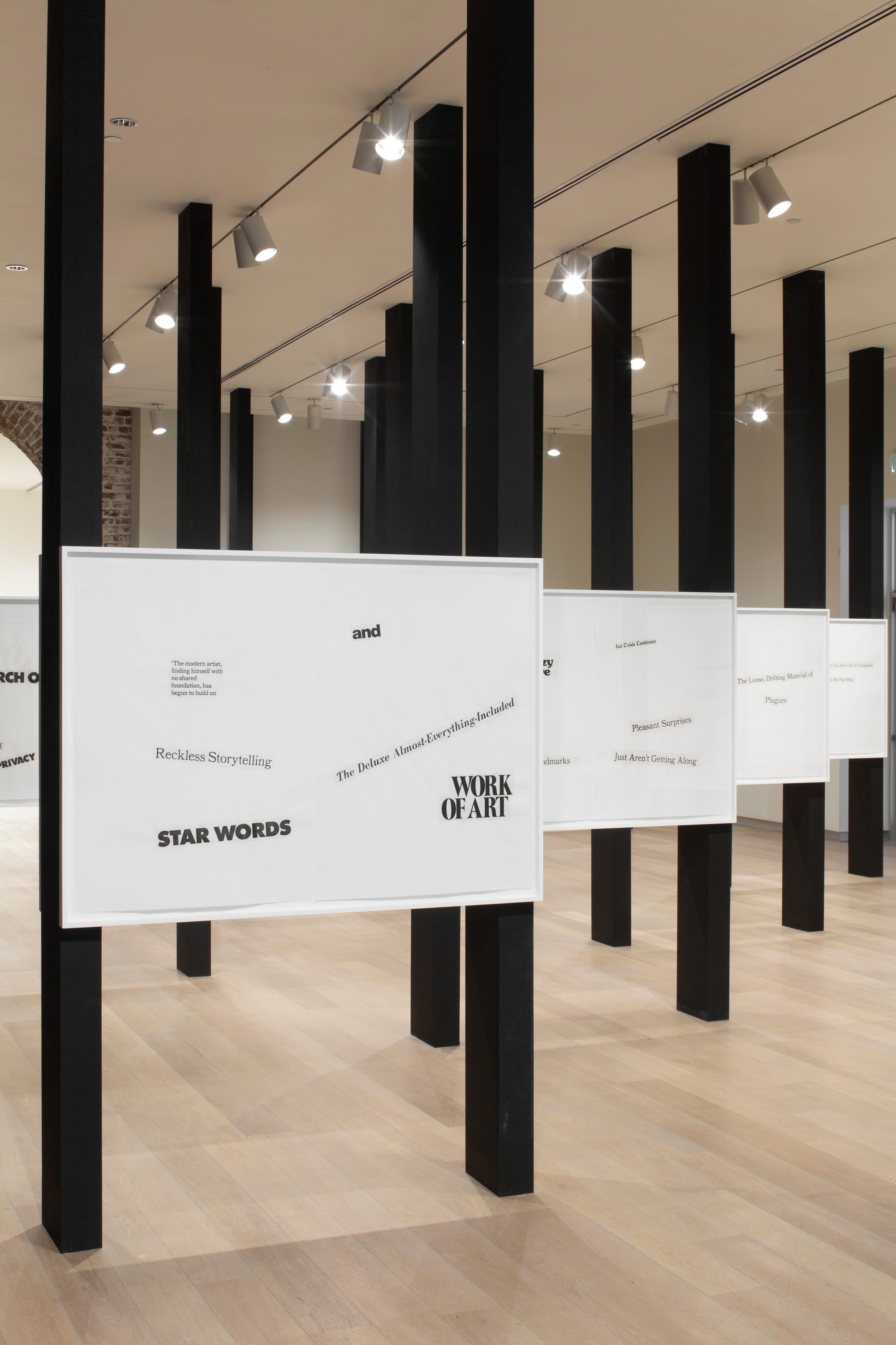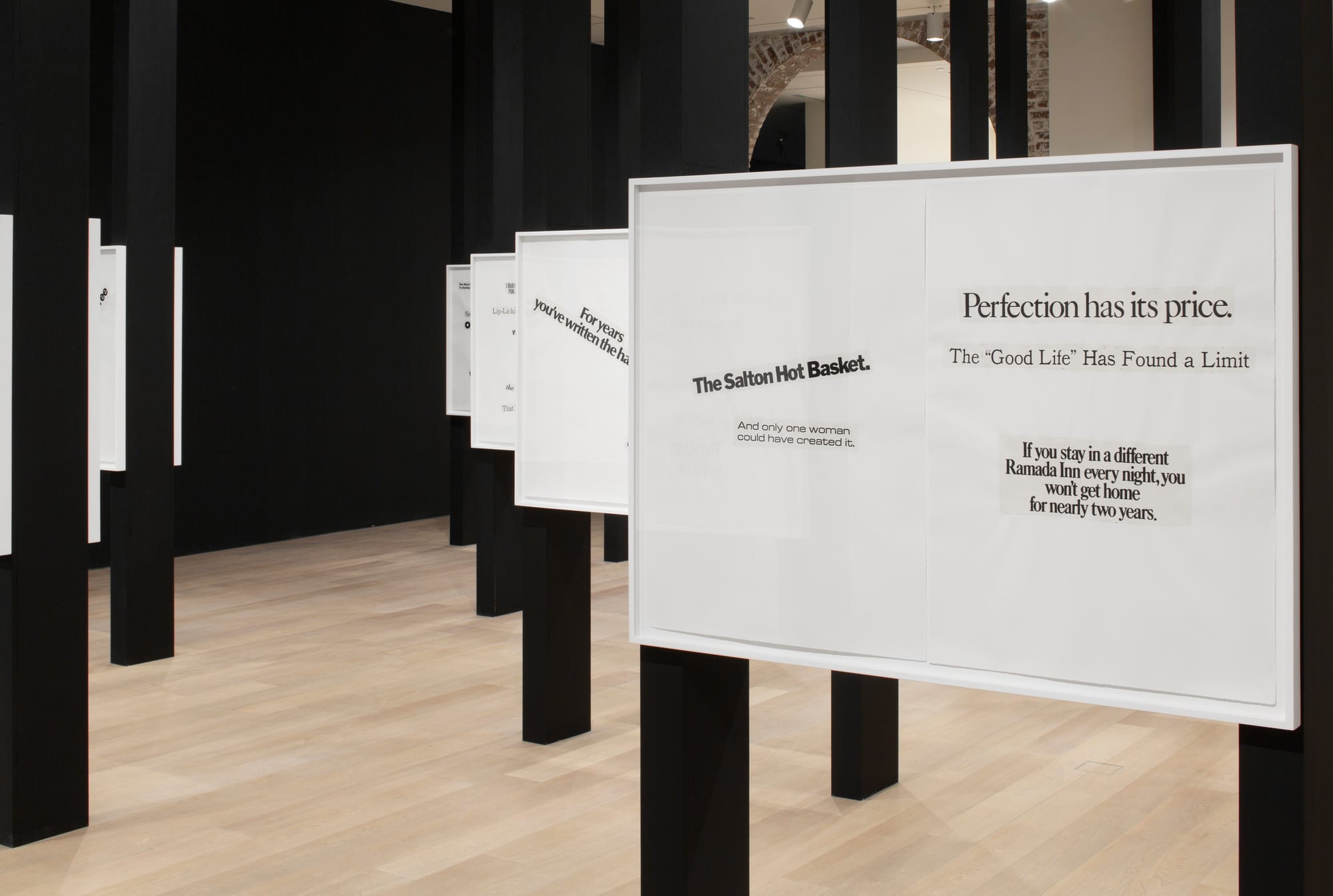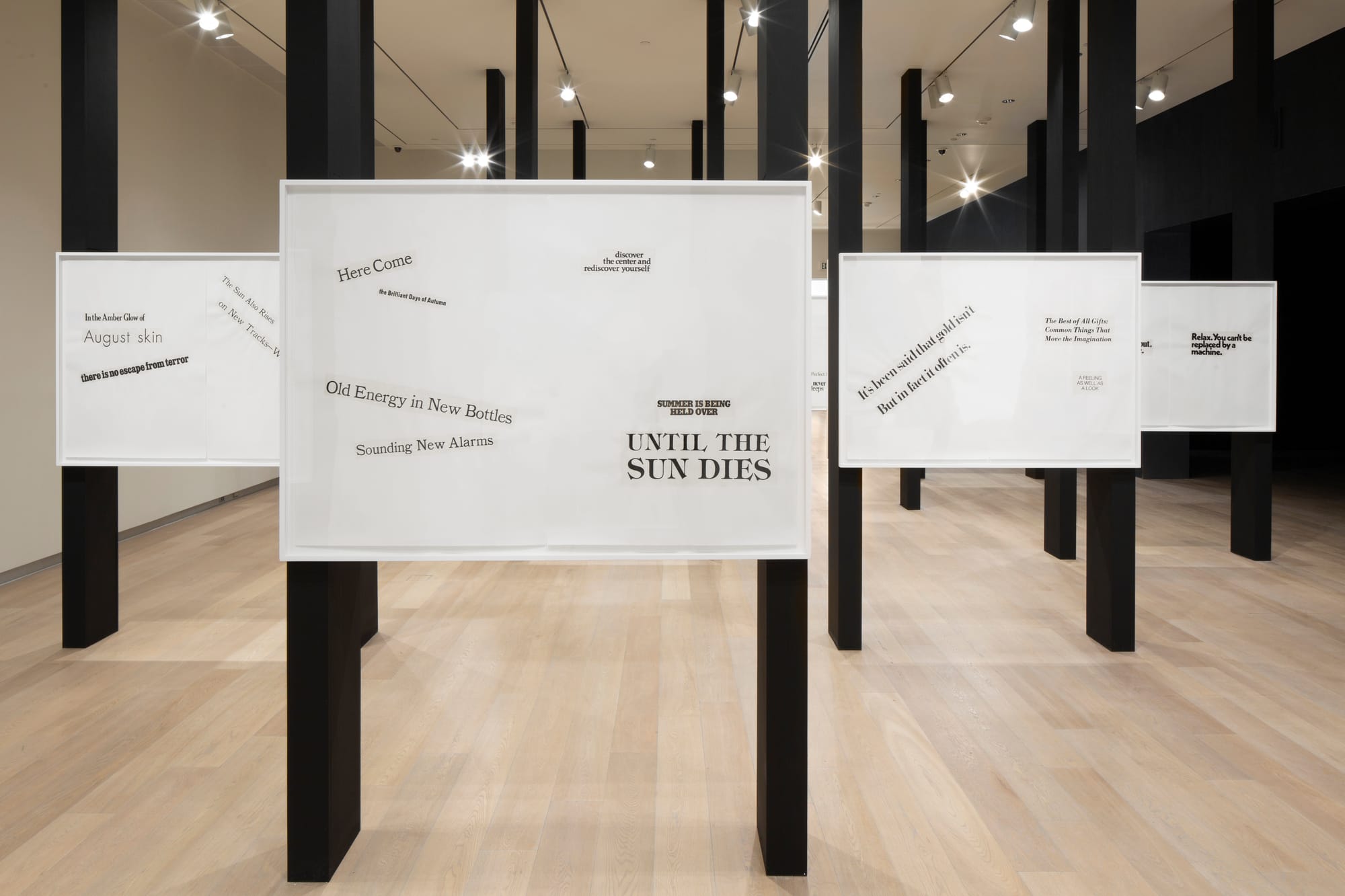The main space features fragments from O’Grady’s series Cutting Out the New York Times (26 “cut-out” or “found” newspaper poems the artist made on successive Sundays, from June 5 to November 20, 1977) and blows them up into over 20 enlarged diptychs. Framed in glass and divided down the center, in the manner of a book spine, they seem almost like pages drawn from an oversized archive. The collection is aptly titled Cutting Out CONYT (1977/2017).