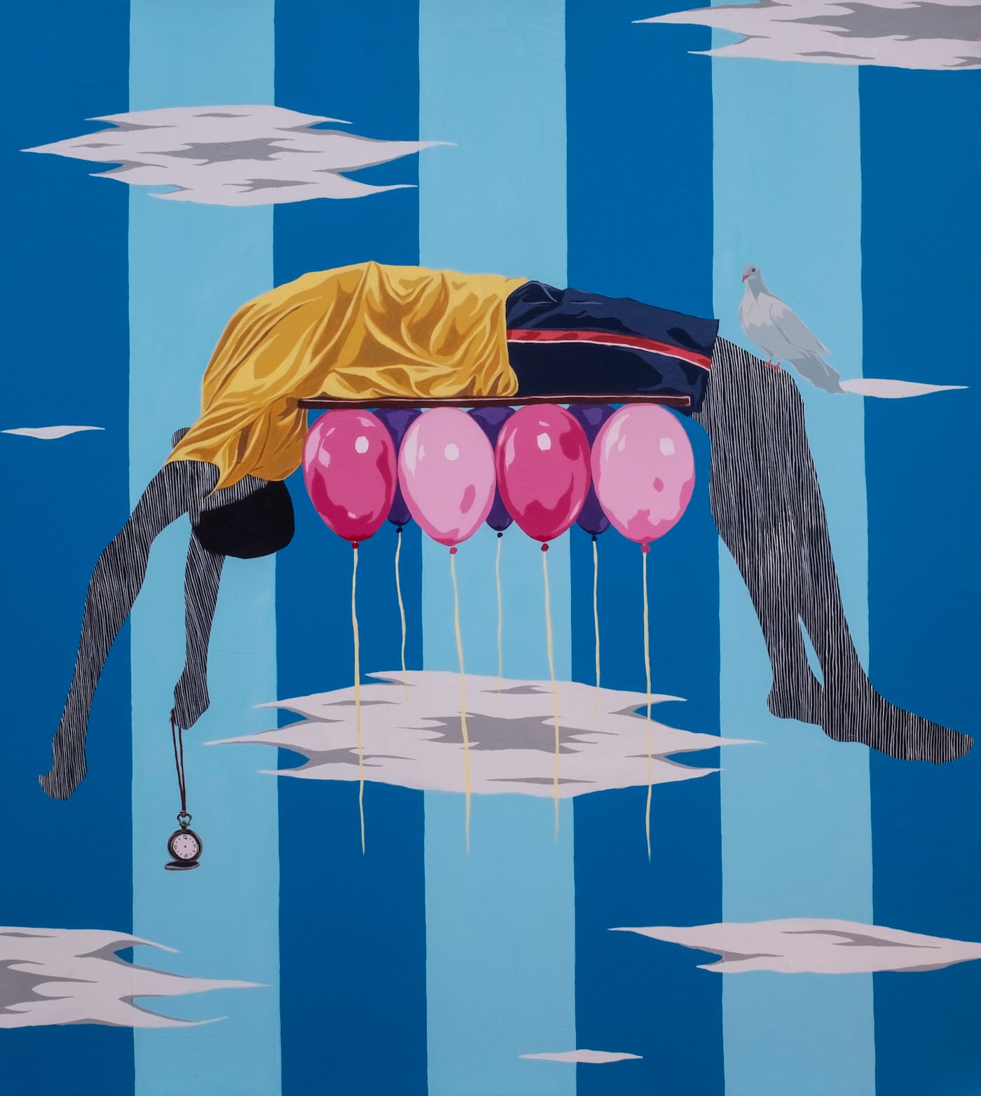 For the second exhibition in its new Los Angeles space, Lagos's Rele Gallery presents paintings by Nigerian artist Ameh Egwuh. Rooted in the writings of psychiatrist Raymond Moody, the dream-like canvases present figures surrounded by birds, balloons, and clocks, floating between two worlds, this one and the next.