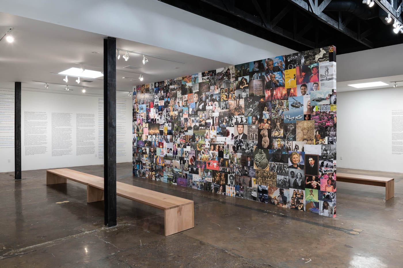 Kandis Williams’s contributions to this year’s Made in LA biennial are dense collages juxtaposing images from film, popular media, art history, and various archives. She works in a similar manner with her publishing project, Cassandra Press, which puts out xeroxed readers compiling writings on a certain topic by intellectuals, activists, and cultural critics. The Absolute Right to Exclude is like one of her readers blown up on the gallery walls, featuring excerpts from Cheryl Harris’s influential 1993 essay “Whiteness as Property,” alongside a list of URL’s expanding on themes of race and gender explored in the essay. A collage on one wall draws on the breadth of images that flood online space, from TikTok to the website of the Smithsonian Institution.