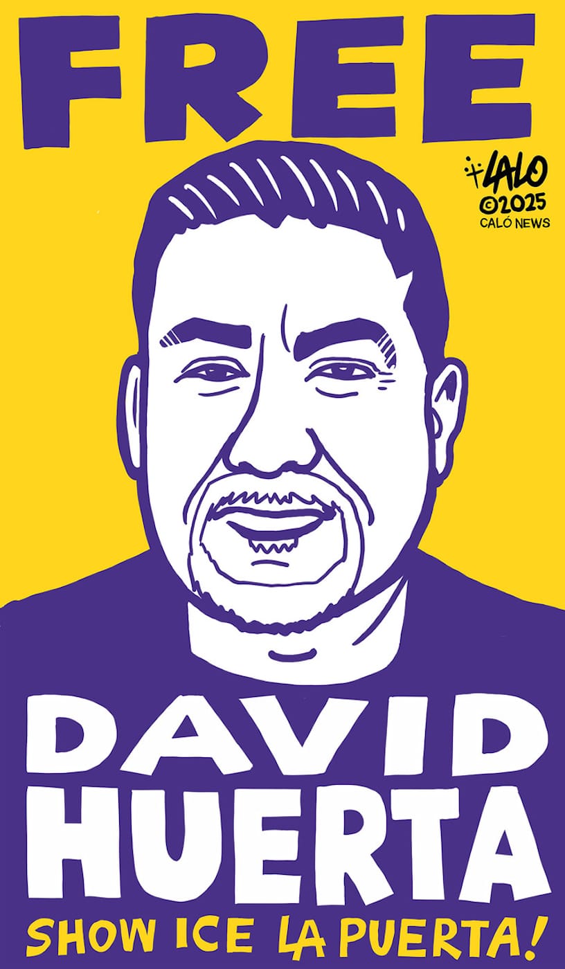 After SEIU President David Huerta was arrested on charges of impeding immigration crackdowns at an LA Protest on Friday, Lalo Alcaraz revamped a painting of the labor leader he had created, adding the text “Free David Huerta” and “Show ICE LA Puerta!” The union printed up posters with the image, and it was featured prominently at a rally on Monday calling for Huerta’s release. (He was released later that day on a $50,000 bond.) “I hope it helped people feel empowered to demand that David be released,” Alcaraz told Hyperallergic. “Images like this can also simply inform people that something is going on in the news that they might and should be interested in.”